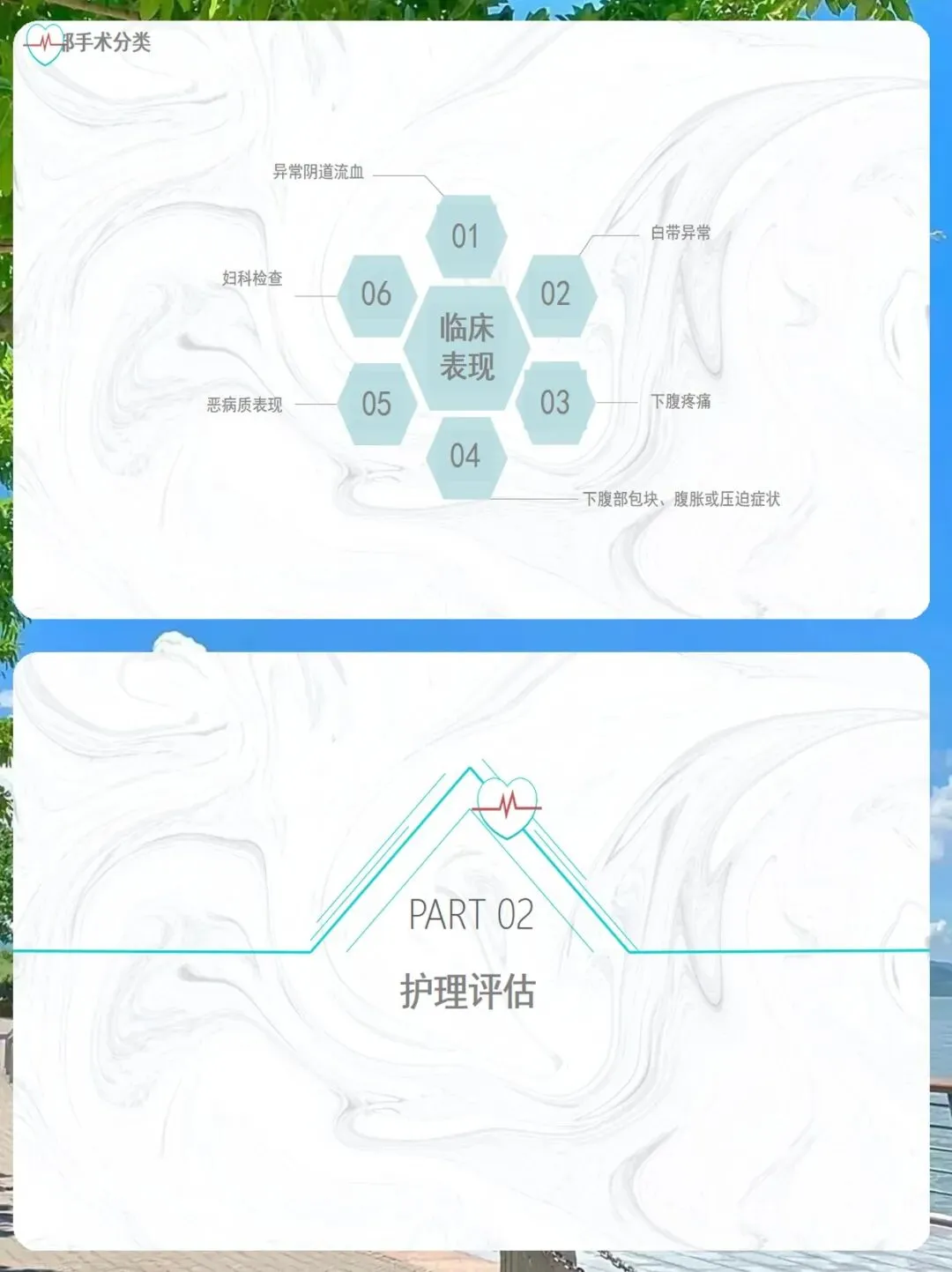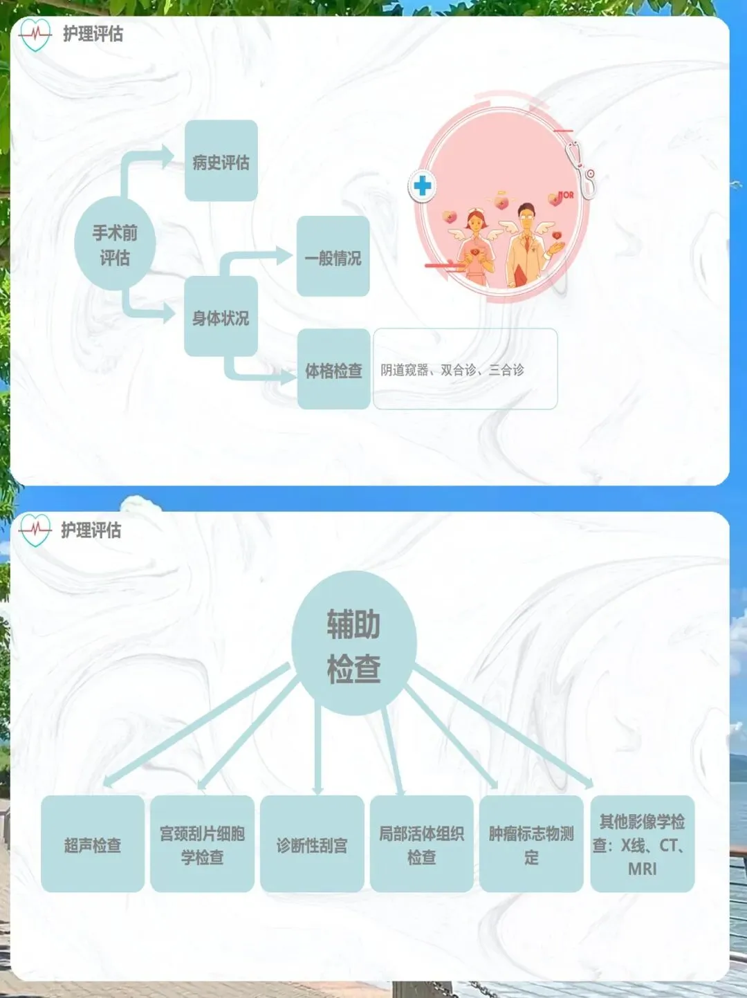 我们的评估分为手术前和手术后两个阶段。手术前,我们需要进行详细的病史评估,包括患者的一般情况、身体状况,以及通过阴道窥器、双合诊、三合诊等体格检查来了解病情。