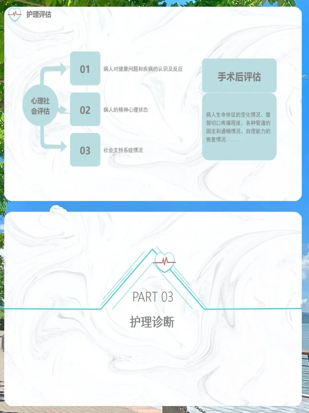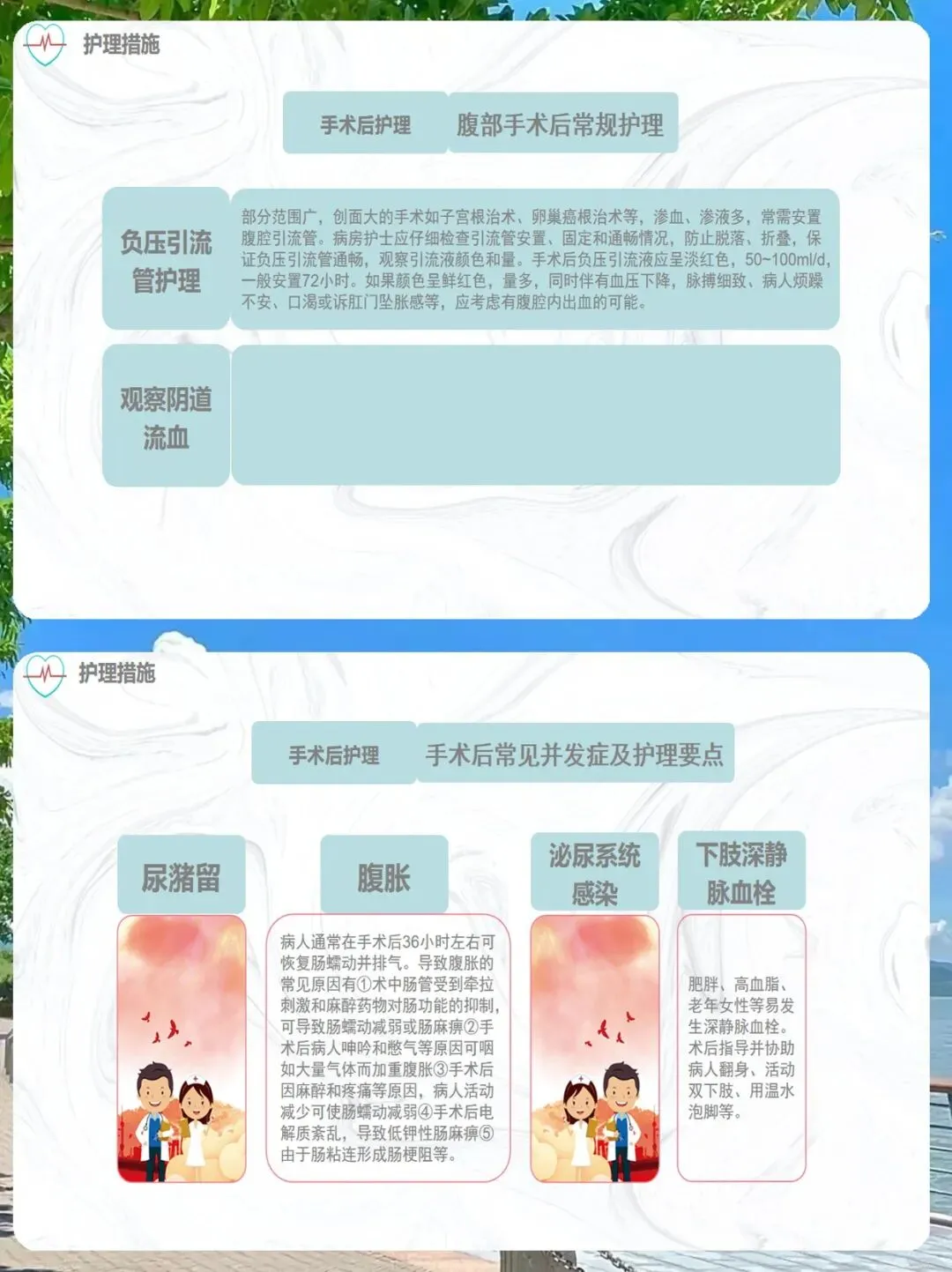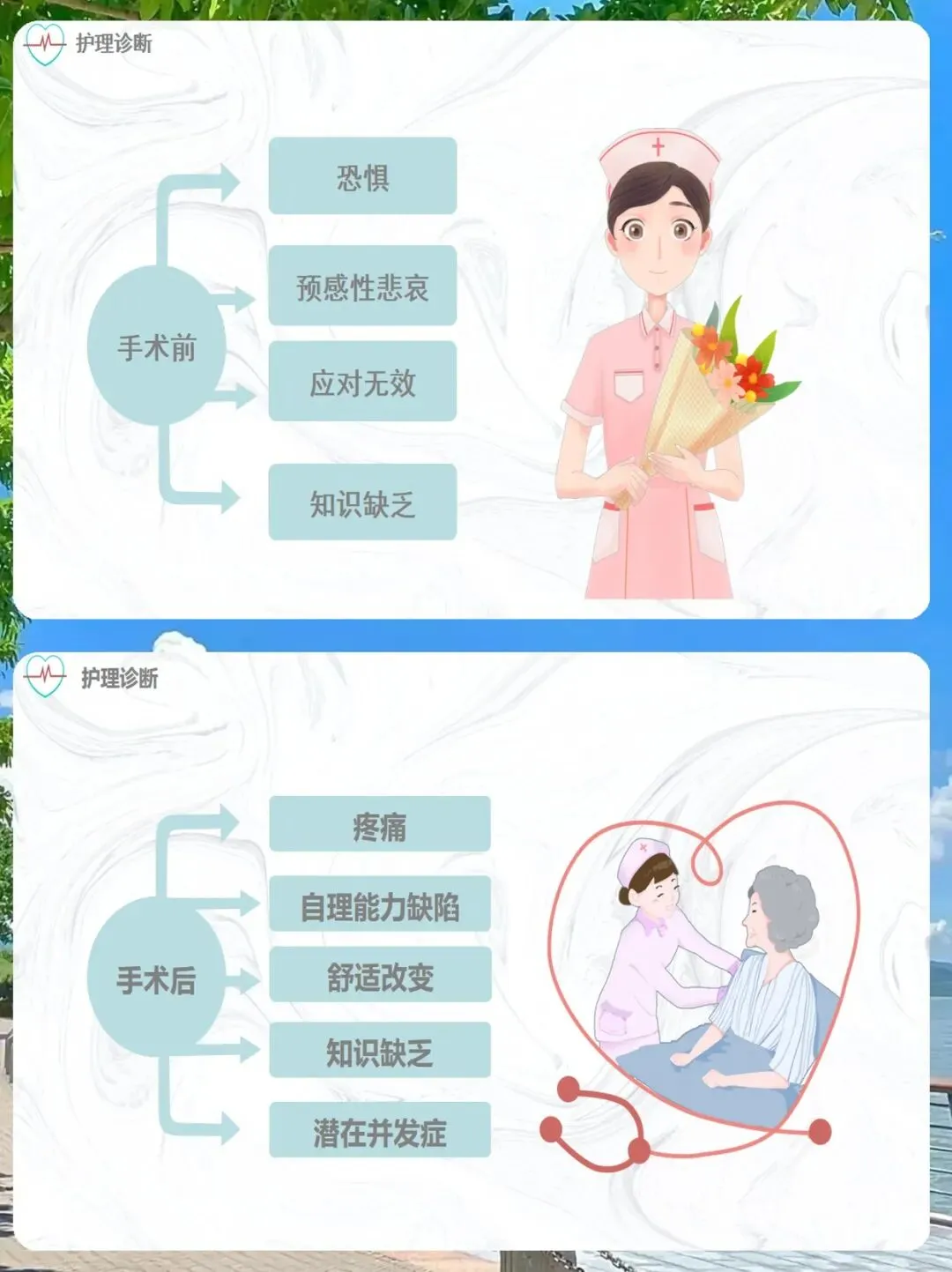 手术后,我们的关注点则转向了疼痛、自理能力缺陷、舒适改变、知识缺乏,以及潜在并发症。我们需要预判可能出现的问题,提前做好准备。