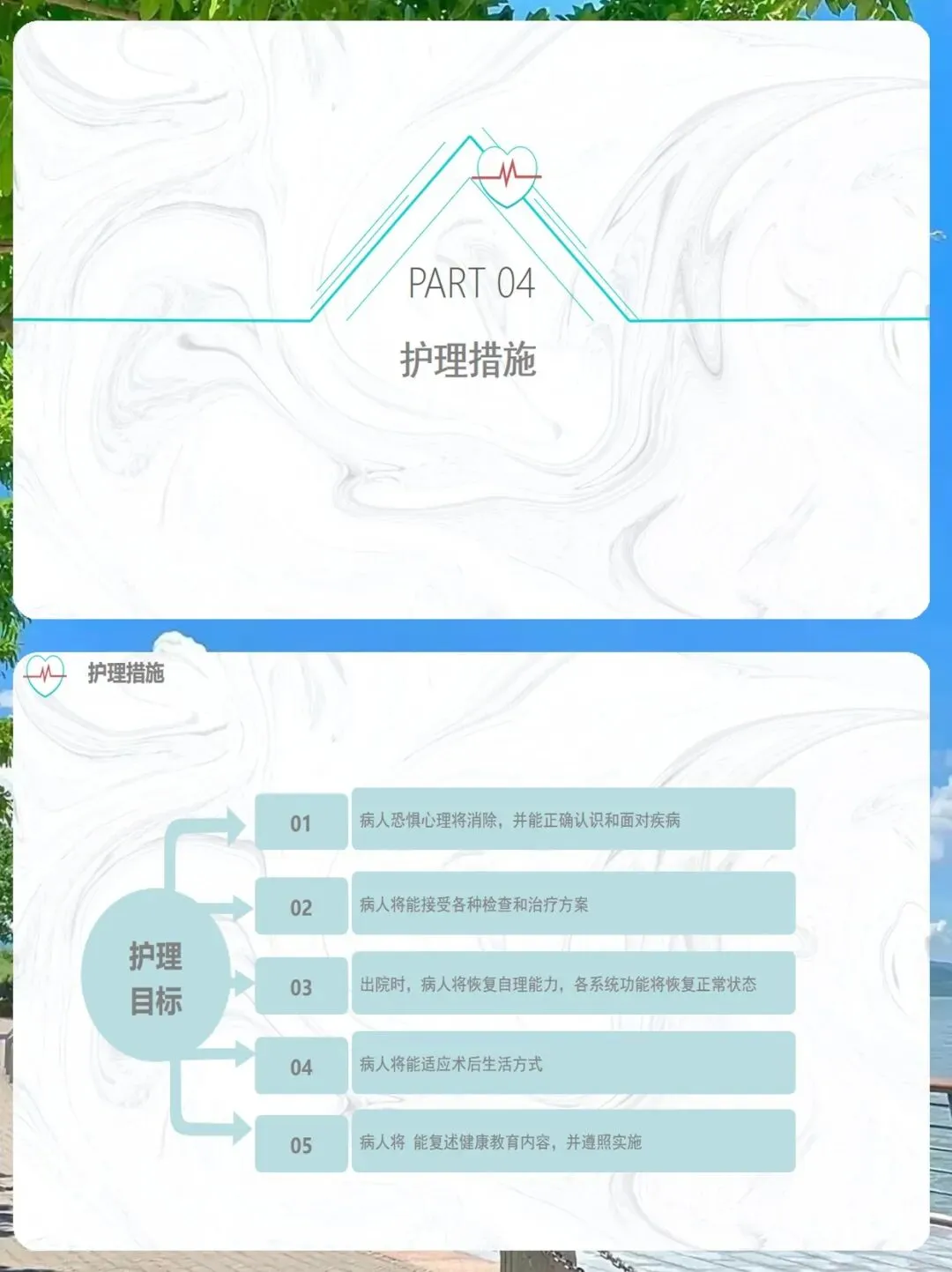 最后,也是最重要的部分:护理措施。我们的护理目标是明确的:消除恐惧、恢复自理能力、适应术后生活方式,并确保患者能复述健康教育内容。