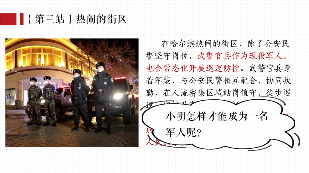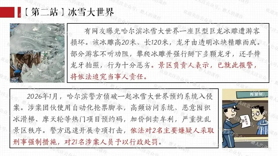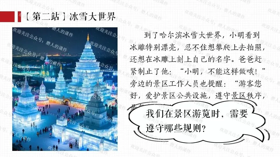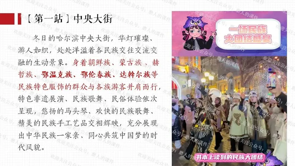 我以春晚分会场热点话题,引出小明一家去哈尔滨旅游的活动主线;分别通过中央大街、冰雪大世界、巴洛克风情街等热门景点中发生的生活实际事例,辅以探究性问题,层层递进,帮助学生更好地学习和理解公民基本义务。课件逻辑清晰,素材丰富,兼具知识讲授和价值引导。