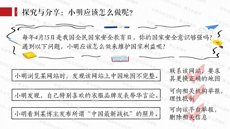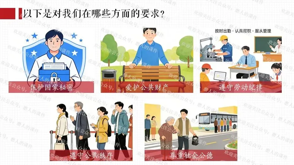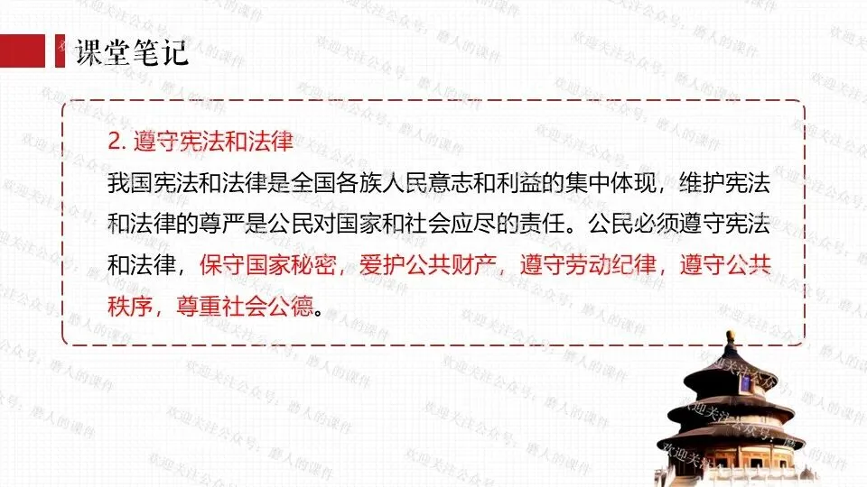 从梳理知识框架、构思上课思路,到找资料、打磨、排版的每一个环节,老师们只要做过课件,都知道是费时费力的,所以知识版权需要大家的尊重,谢绝拼课件,私自传播是侵权行为,请做一名有德守法的道德与法治教师。