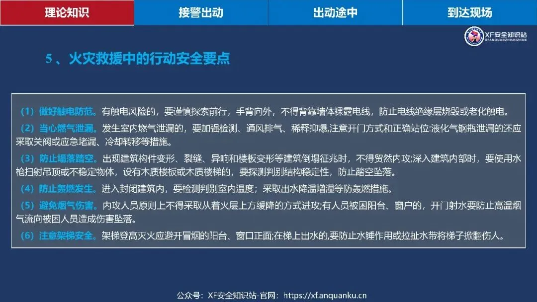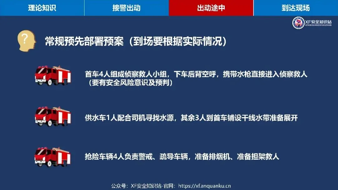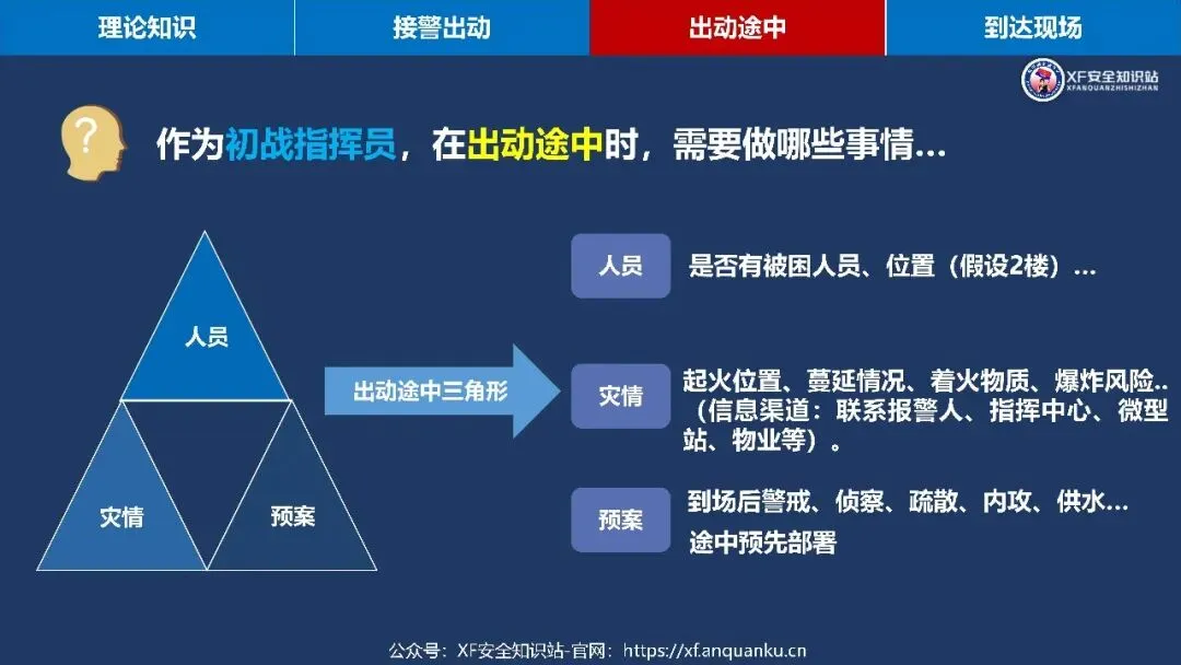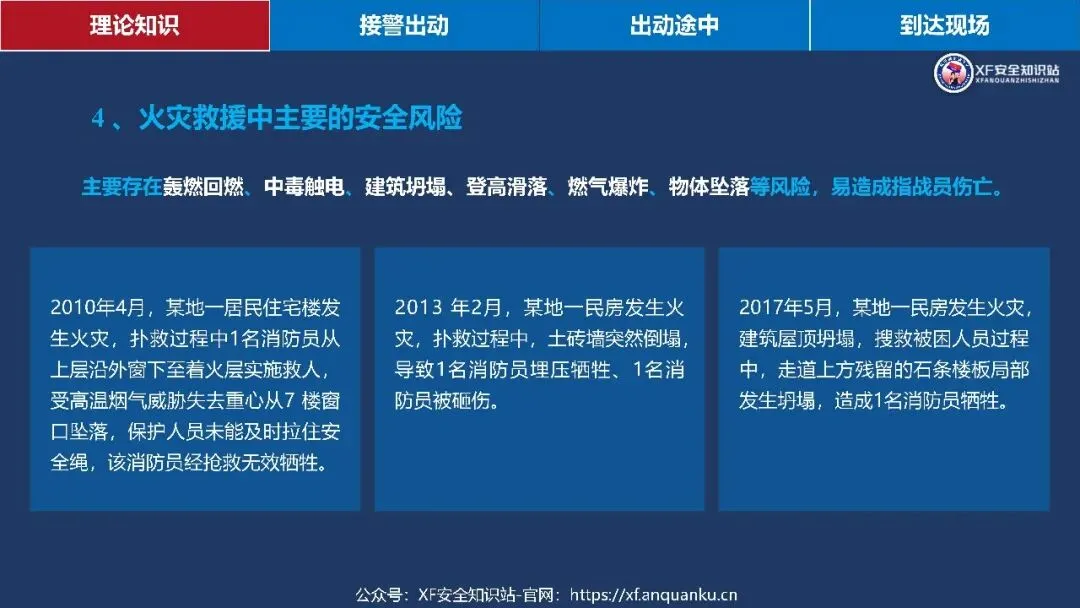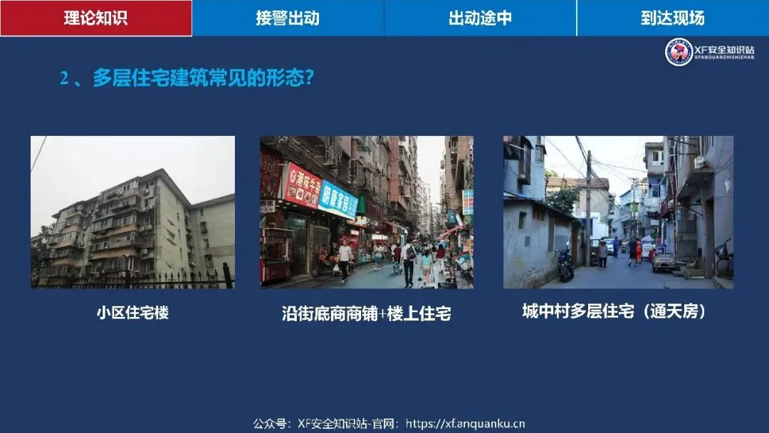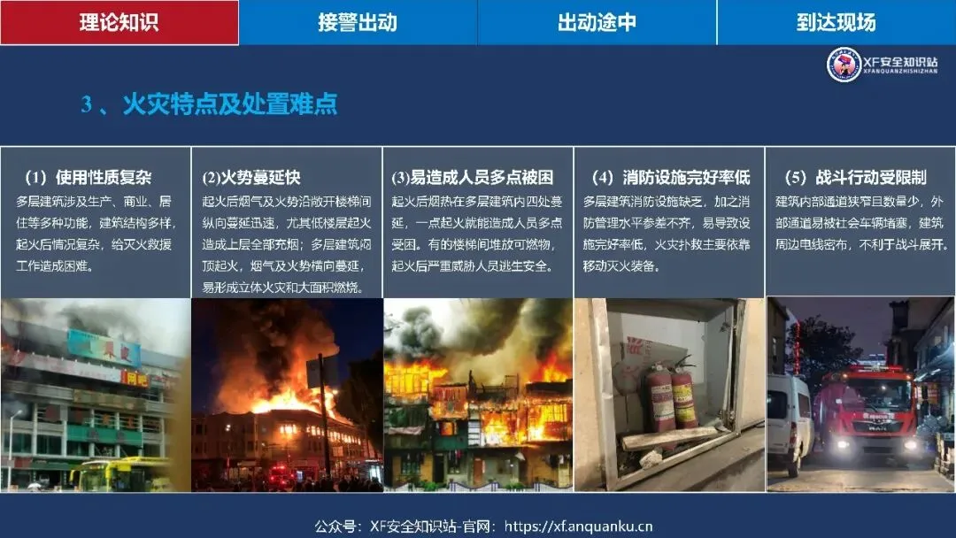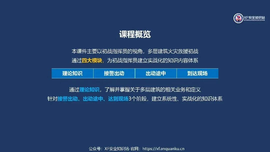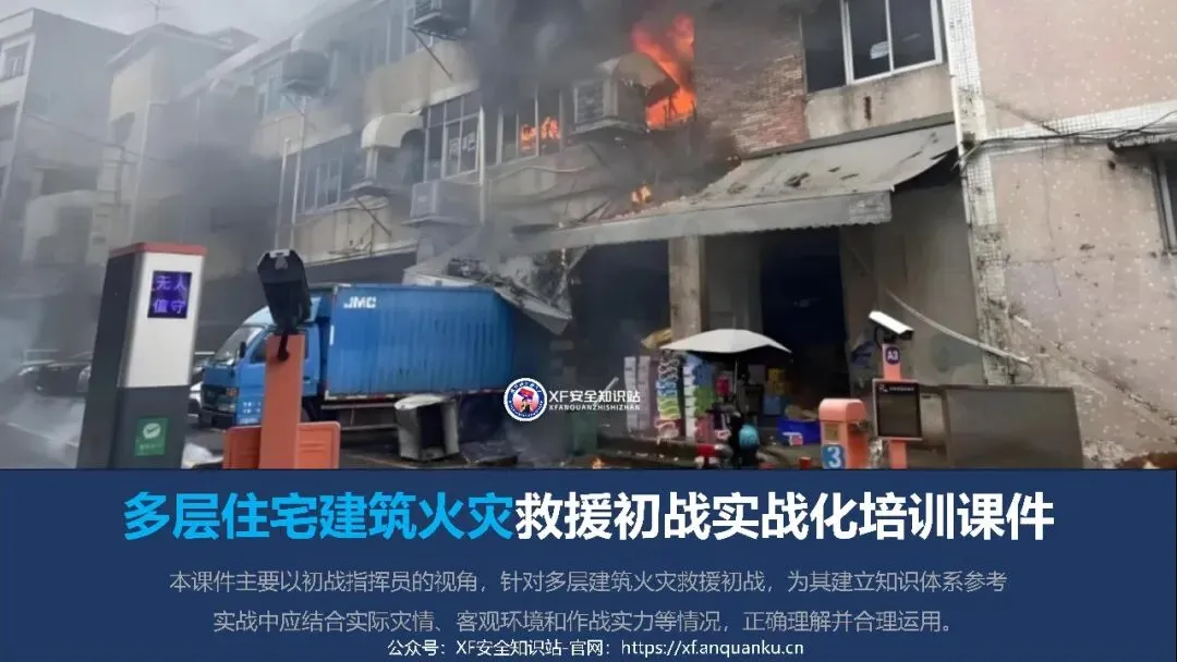 本课件以多层建筑火灾救援初战指挥员为核心,围绕理论知识、接警出动、出动途中、到达现场四大模块搭建实战化知识体系,明确多层住宅建筑定义为二层及以上、建筑高度≤27m 的住宅建筑,梳理其三类常见形态、五大火灾特点及处置难点、六大救援安全风险与对应的行动安全要点,还通过接警出动、出动途中、到达现场三个阶段的三角形核心要素(人员 / 装备 / 车辆、人员 / 灾情 / 预案、侦察 / 警戒 / 展开)明确初战指挥员各阶段工作要求,同时给出阵地设置参考,强调救援需结合实际灾情、环境和作战实力灵活运用知识。