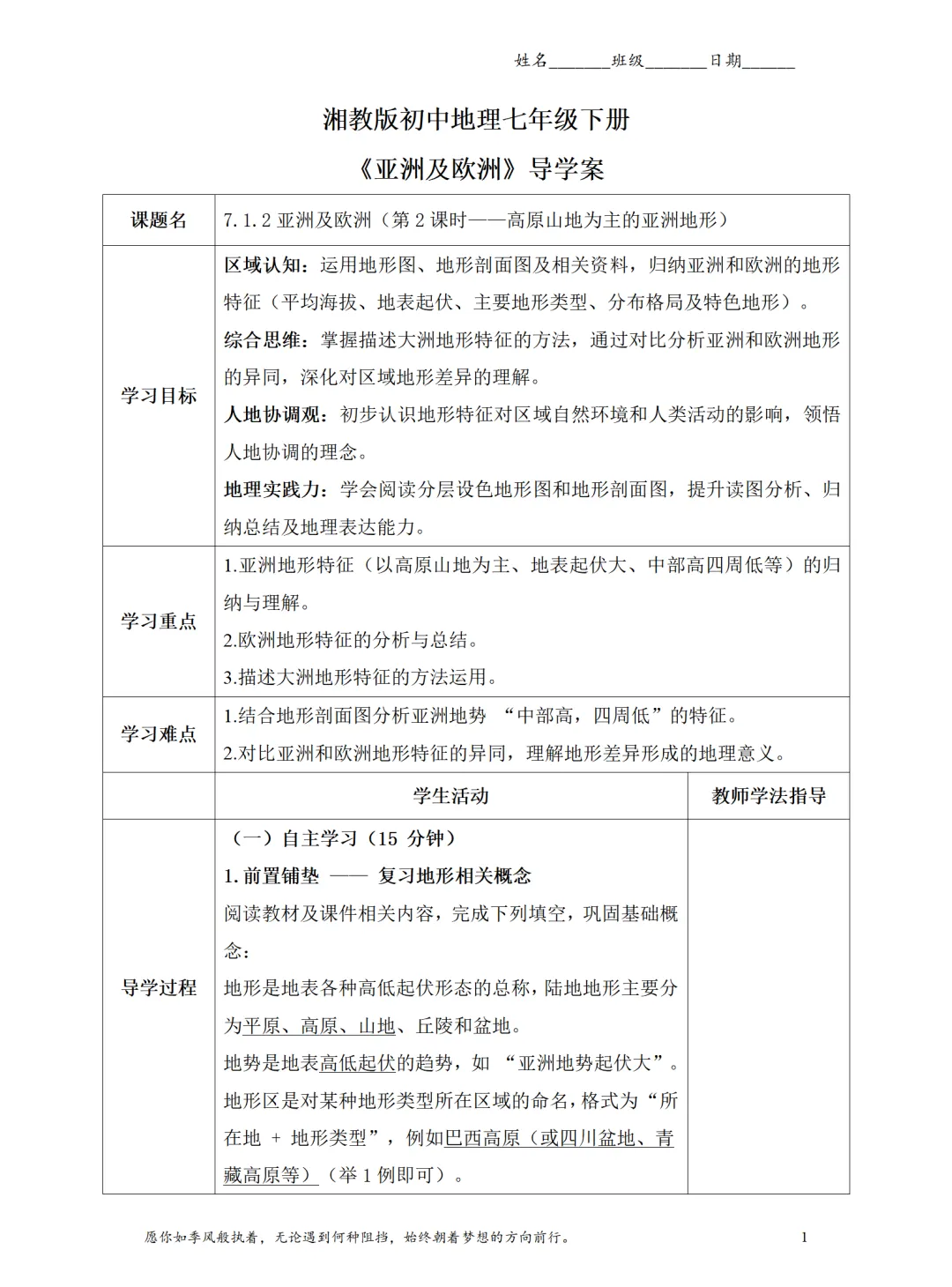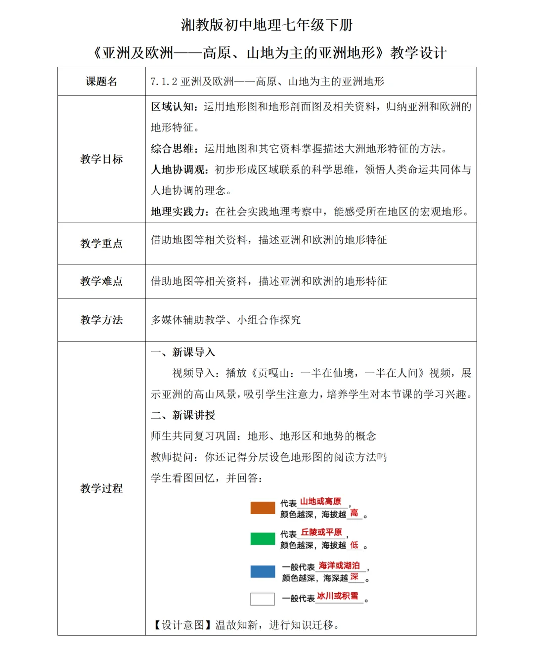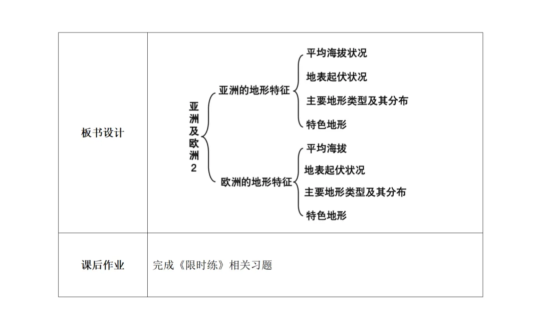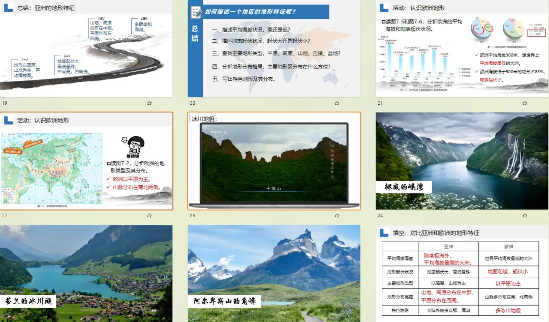 通过小组活动自主分析欧洲地形,明确其 “平均海拔最低、地表起伏小、以平原为主、山脉分布在南北两侧、多冰川地貌” 的特征;再以表格形式对比亚欧地形的海拔、起伏、类型、分布及特色地形,强化差异认知。