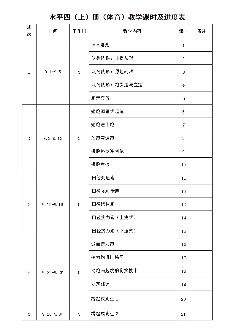 初中各年级体育教学进度表