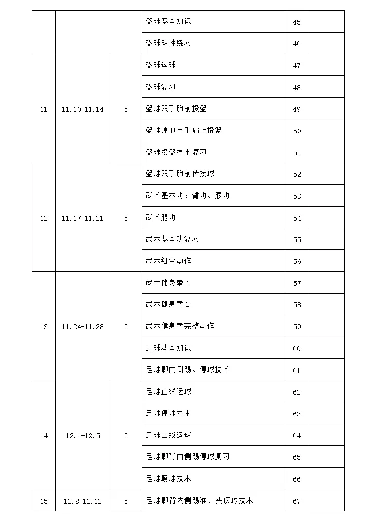 十五 | 43 | 身体素质考核: 男生:五十米跑 女生:仰卧起坐 自选项目: 篮球 足球 排球 羽毛球 |