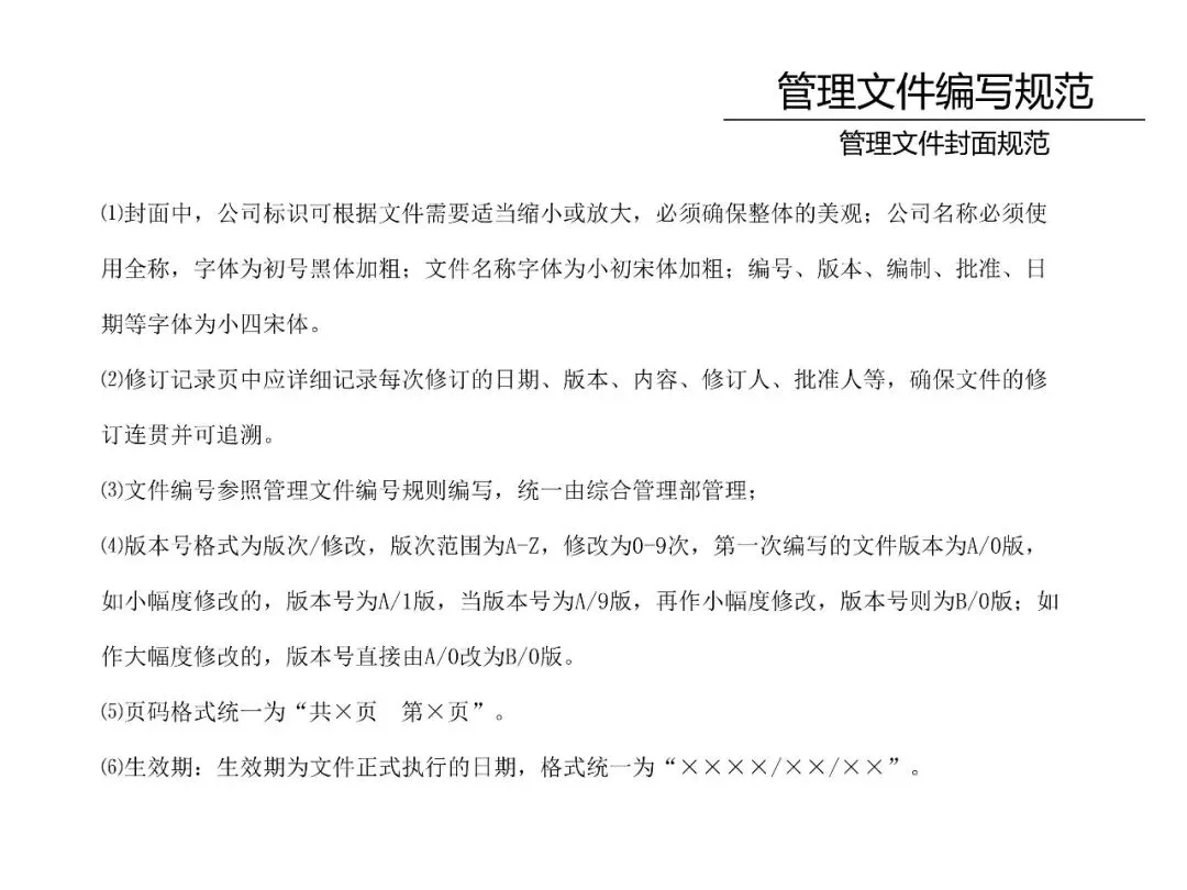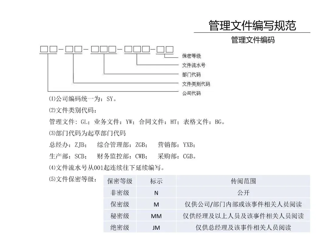 1.管理文件:指为规范公司管理而发布的指导性文件,包括:管理制度、流程、规定、规范、办法、程序等。
