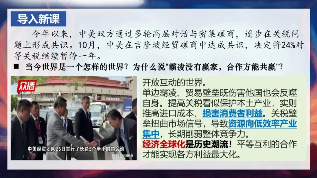 各位同学,大家好!今天我们要开启九年级下册道德与法治的第一课——《开放互动的世界》。在正式进入新课之前,先和大家分享一个近期的时政热点:今年以来,中美双方通过多轮高层对话与密集磋商,在关税问题上逐步形成共识,10月在吉隆坡经贸磋商中,双方决定将24%的对等关税继续暂停一年。