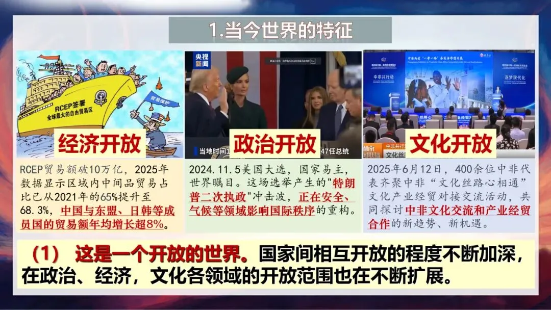 好,时间到!谁来分享一下自己的发现?这位同学说得很好,他提到了“开放”。我们来看几个案例:2025年6月,400余位中非代表齐聚“文化丝路心相通”活动,探讨文化交流与经贸合作;RCEP作为全球最大的自由贸易区,2025年贸易额破10万亿,区域内中间品贸易占比提升到68.3%;还有2024年美国大选,其结果在安全、气候等领域影响着国际秩序。这些都说明,当今世界是开放的世界,国家间相互开放的程度不断加深,政治、经济、文化各领域的开放范围也在持续扩展。