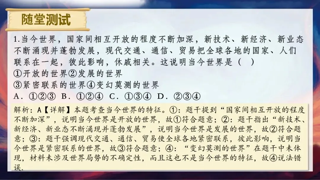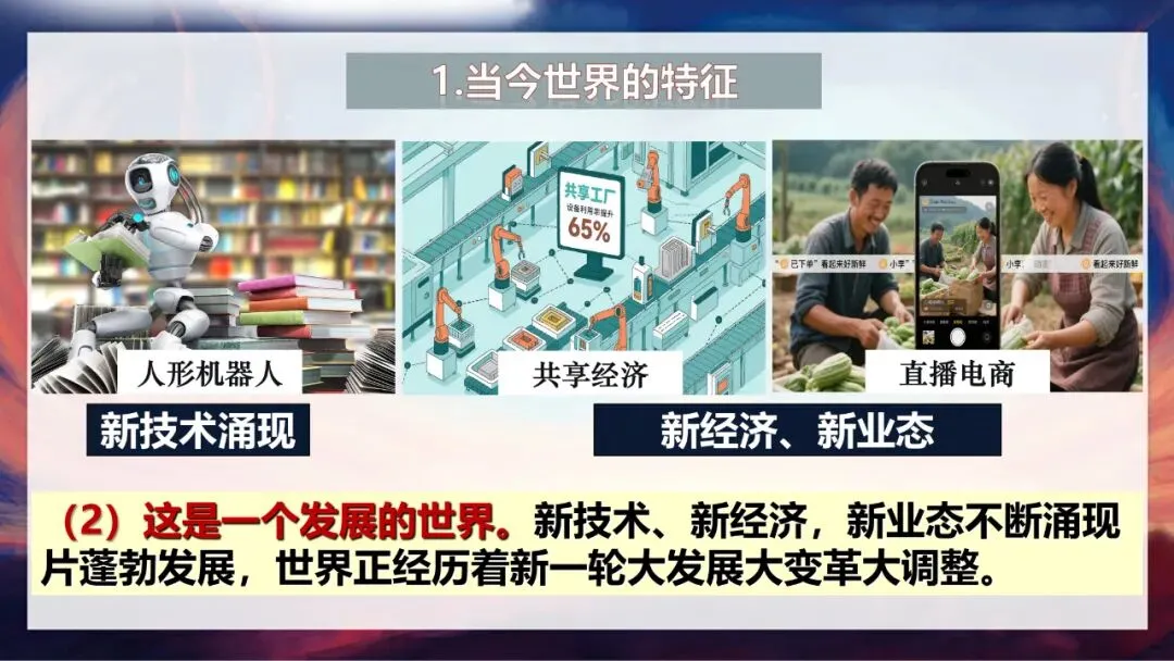 还有同学提到了“发展”,非常准确!大家想想,我们现在熟悉的直播电商、人形机器人、共享经济,都是新技术催生的新经济、新业态。现实中,AR试妆功能提升了消费者体验,共享工厂让设备利用率提升65%,这些都证明世界正经历着新一轮大发展、大变革、大调整,这是一个发展的世界。