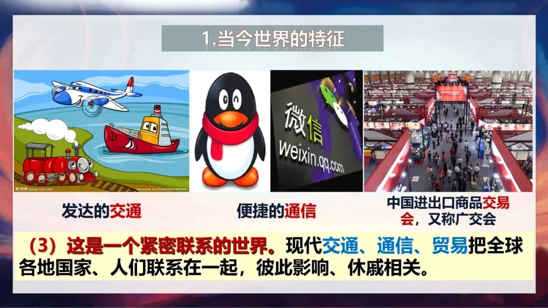 除此之外,当今世界还是紧密联系的世界。中国进出口商品交易会(广交会)连接着全球的供需两端,发达的交通让跨国出行变得便捷,微信等通信工具让远隔重洋的人们能随时沟通。现代交通、通信、贸易把全球各地的国家和人们紧紧联系在一起,彼此影响、休戚相关。