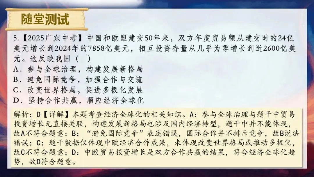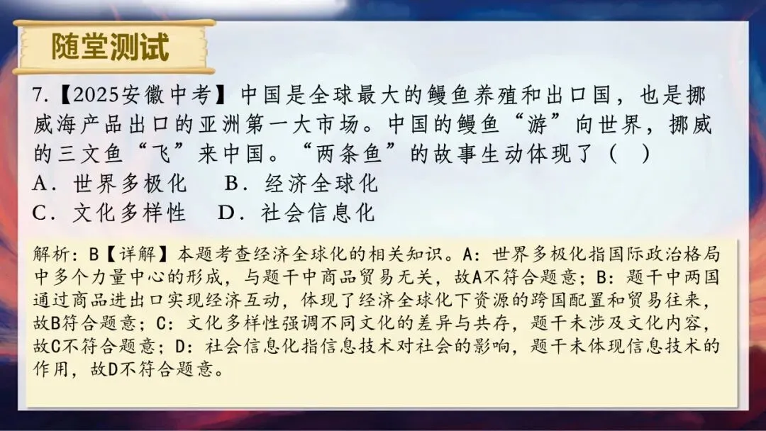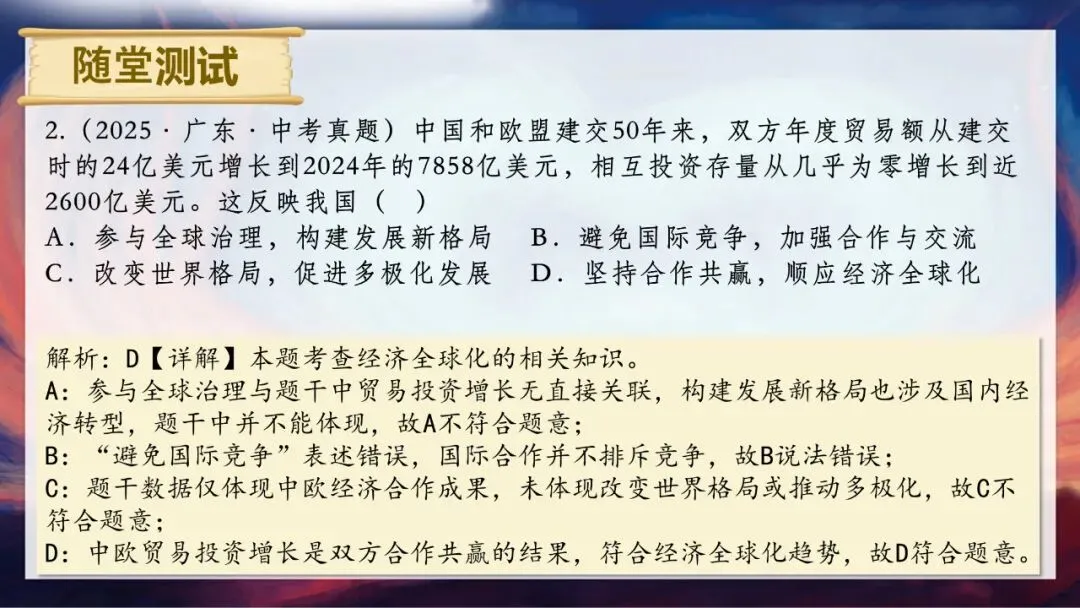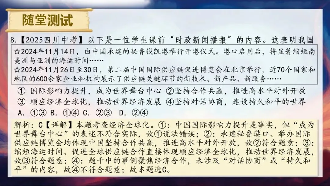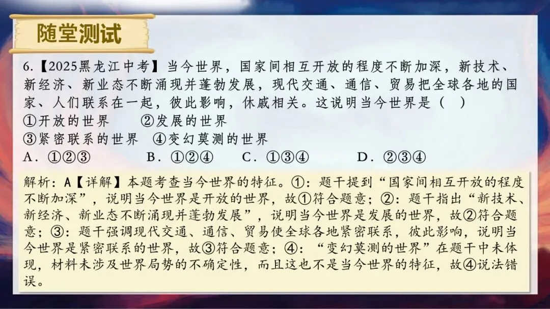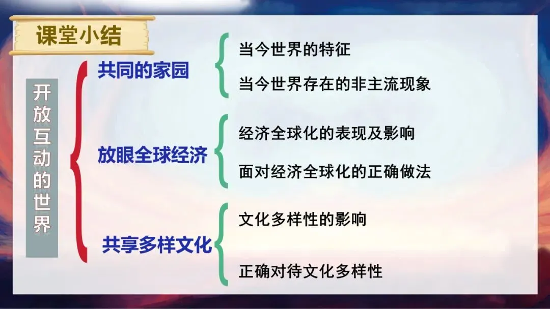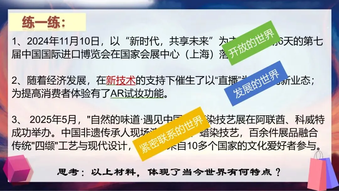 请大家思考两个问题:当今世界到底是一个怎样的世界?为什么说“霸凌没有赢家,合作方能共赢”?答案很明确,我们生活的世界是开放互动的。单边霸凌和贸易壁垒看似能保护本土产业,实则会推高进口成本,损害消费者利益,还会扭曲市场信号,让资源流向低效率产业,长期来看会削弱国家整体竞争力。而经济全球化是不可逆转的历史潮流,只有平等互利的合作,才能让各方利益最大化。今天,就让我们一起走进这个开放互动的世界。