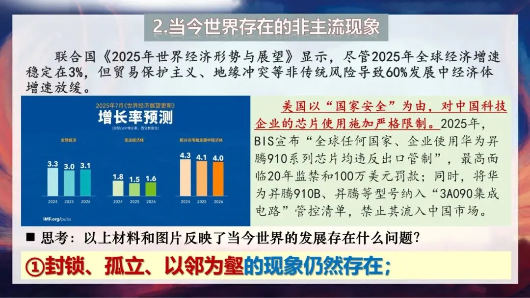 不过,我们也要客观认识到,世界的发展并不是完美的。请大家看看这些材料:联合国《2025年世界经济形势与展望》显示,贸易保护主义、地缘冲突导致60%的发展中经济体增速放缓;美国以“国家安全”为由,对中国科技企业的芯片使用施加严格限制,甚至将华为部分芯片纳入管控清单;中东和北非地区前10%人口收入占总收入的58%,而欧洲这一比例约为36%,南北发展不平衡问题依然突出。