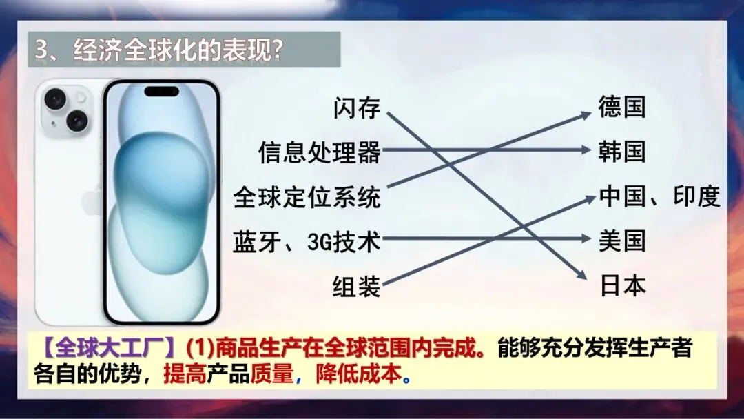大家思考一下,这些案例体现了经济全球化的哪些表现?对,首先是商品生产在全球范围内完成。不同国家的生产者发挥各自优势,共同完成产品生产,既能提高产品质量,又能降低成本。就像华为手机,整合了多个国家的优质资源,才形成了最终的产品。