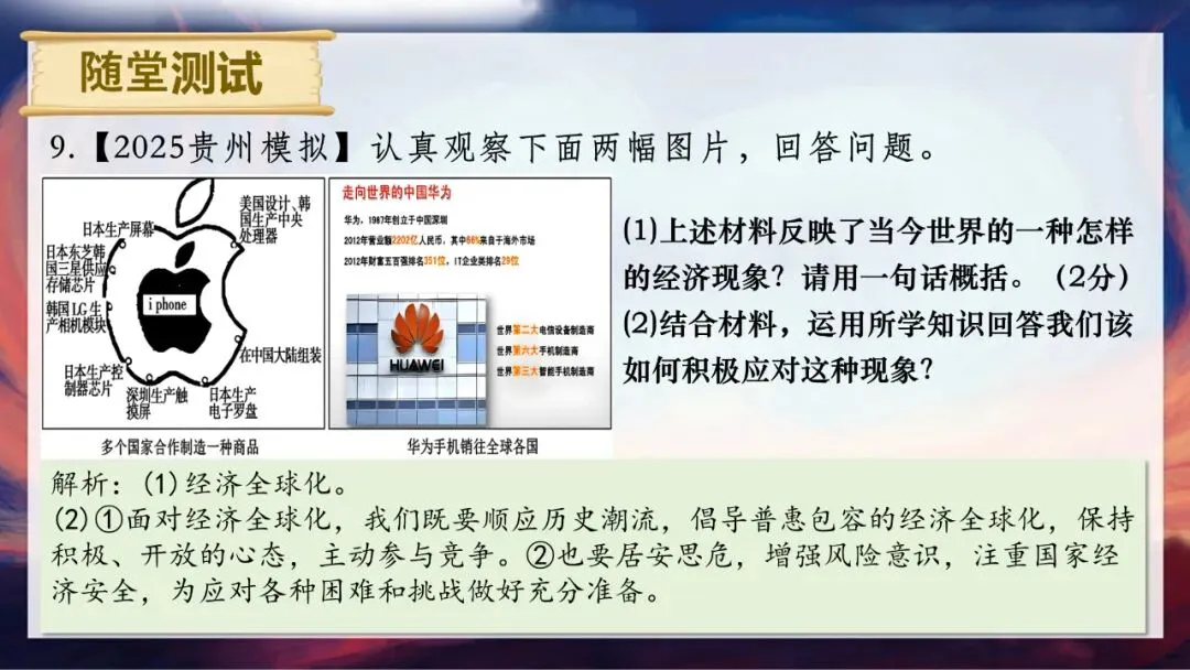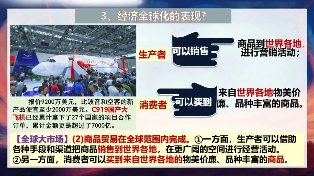 了解了世界的整体情况,接下来我们聚焦经济领域,一起解读经济全球化的影响和应对。大家先看课件上的图片:华为手机的处理器由美国设计、韩国生产,屏幕来自日本,存储芯片由日本东芝和韩国三星供应,最终在中国大陆组装,销往全球各国;C919国产大飞机累计拿下27个国家的合作订单,金额超过7000亿。