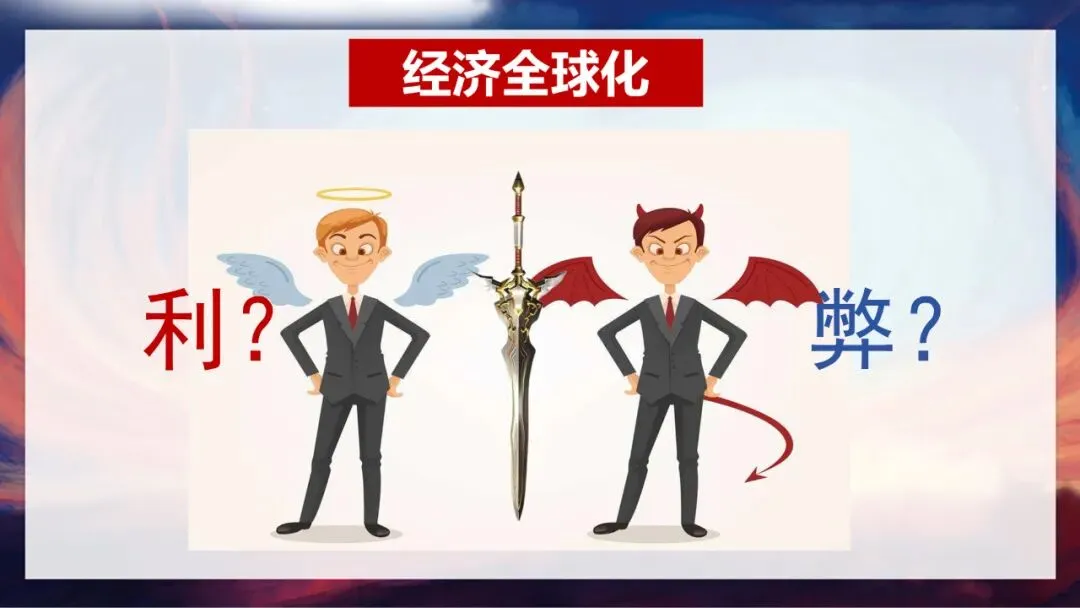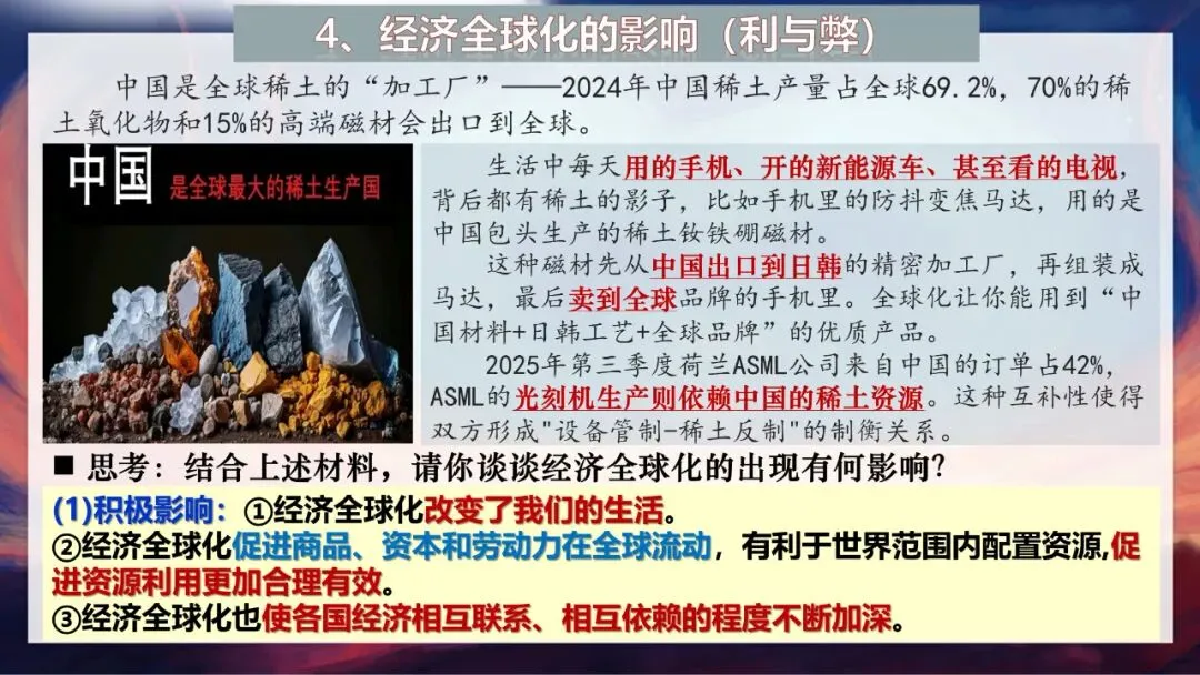 那么经济全球化给我们带来了什么影响呢?我们从正反两方面来看。先说说积极影响:第一,经济全球化改变了我们的生活,我们日常用的手机、新能源车、电视,背后都可能有全球产业链的支撑;第二,它促进商品、资本和劳动力在全球流动,有利于世界范围内配置资源,让资源利用更加合理有效;第三,它使各国经济相互联系、相互依赖的程度不断加深,就像中国稀土和ASML光刻机的关系,形成了相互制衡又互利共赢的局面。