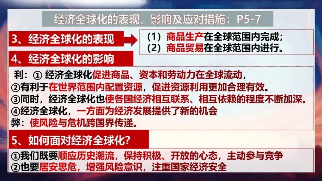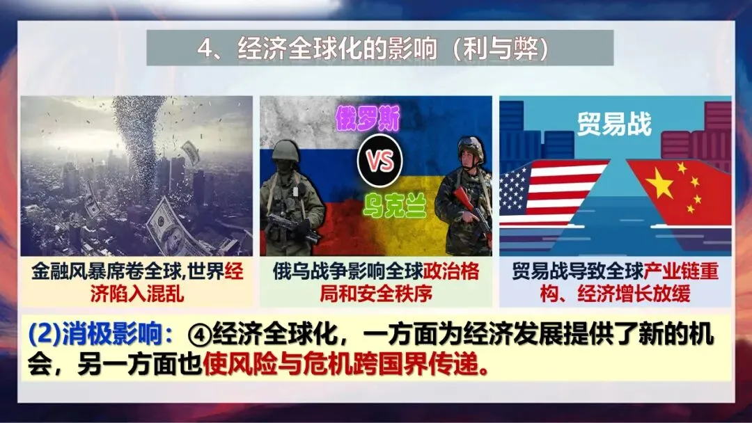 但经济全球化也有消极影响。大家回忆一下,2008年金融风暴席卷全球,让世界经济陷入混乱;俄乌战争等地缘冲突影响地区安全,为世界发展带来诸多不确定性;贸易战更是让多个国家的经济利益受损。这些都说明,经济全球化在带来发展机遇的同时,也使风险与危机能够跨国界传递。