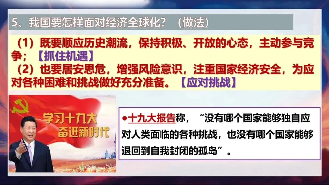 面对这样的经济全球化,我们该如何应对呢?十九大报告中提到:“没有哪个国家能够独自应对人类面临的各种挑战,也没有哪个国家能够退回到自我封闭的孤岛。”这告诉我们,首先要顺应历史潮流,保持积极、开放的心态,主动参与竞争,抓住经济全球化带来的发展机遇;其次要居安思危,增强风险意识,注重国家经济安全,为应对各种困难和挑战做好充分准备。