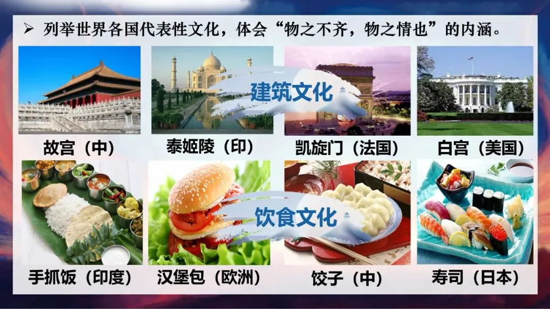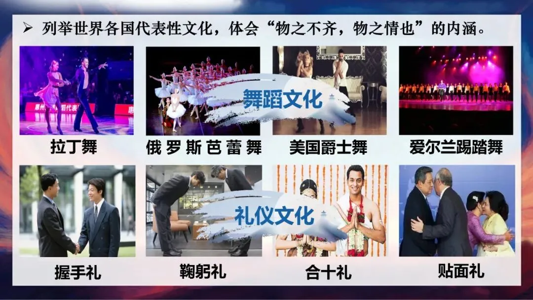 经济全球化让各国经济紧密相连,也让不同文化频繁交流。接下来,我们走进第三个模块——共享多样文化,拥抱世界的多元之美。大家看课件上的图片:中国的故宫、印度的泰姬陵、法国的凯旋门,展现了不同的建筑文化;中国的饺子、日本的寿司、印度的手抓饭、欧洲的汉堡包,代表了多样的饮食文化;还有握手礼、鞠躬礼、合十礼、贴面礼等不同的礼仪,以及俄罗斯芭蕾舞、爱尔兰踢踏舞、中国武术与街舞的结合,这些都是世界文化多样性的体现。