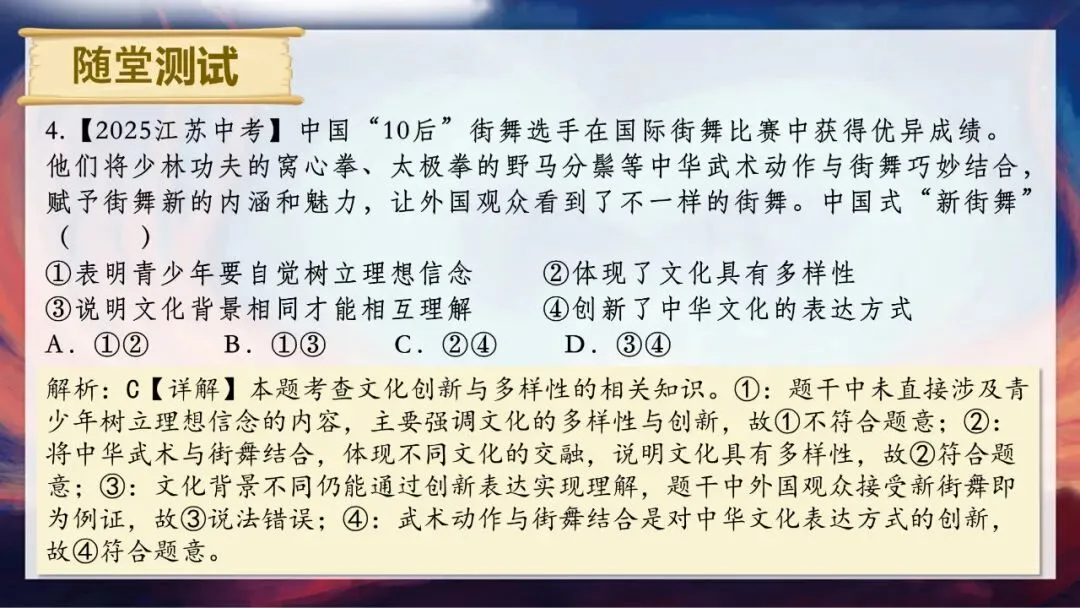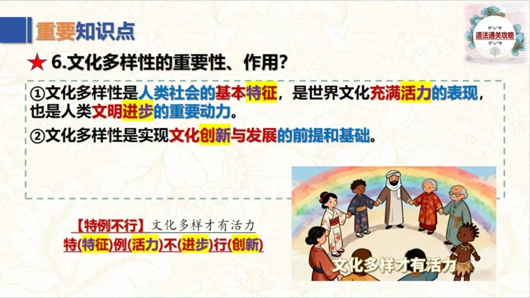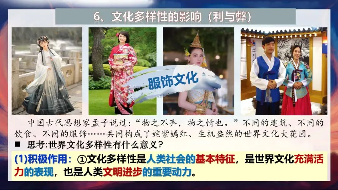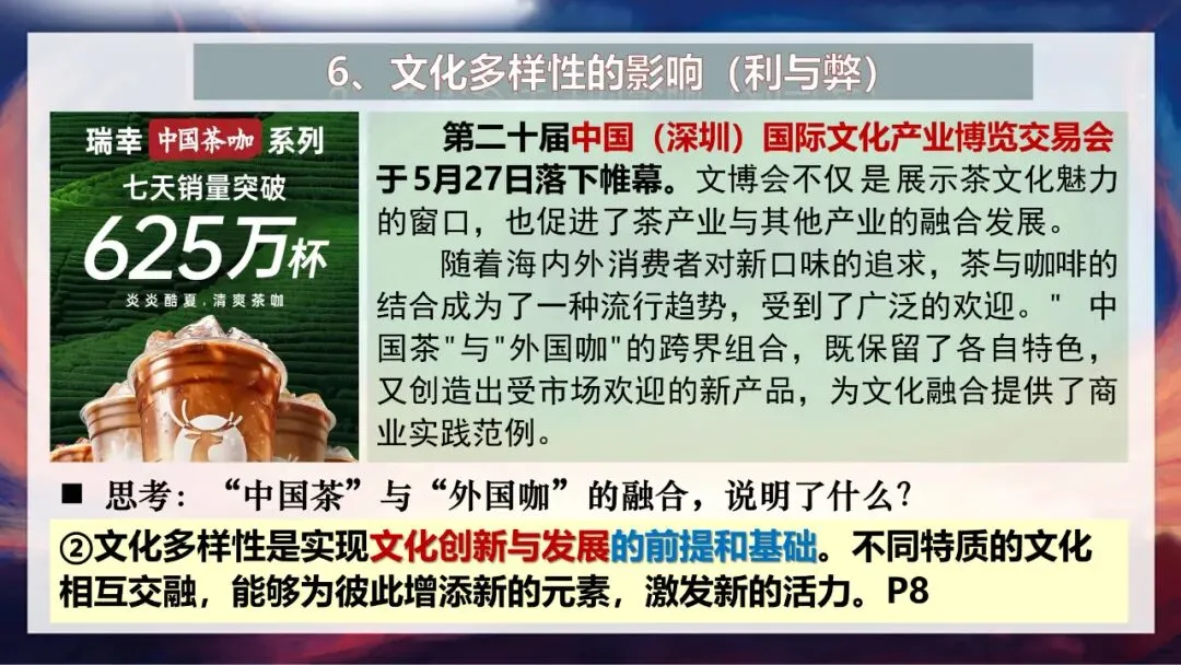 首先,文化多样性是人类社会的基本特征,是世界文化充满活力的表现,也是人类文明进步的重要动力。没有多样的文化,世界就会变得单调乏味。其次,文化多样性是实现文化创新与发展的前提和基础。就像课件中提到的,“中国茶”与“外国咖”跨界组合,瑞幸中国茶咖系列七天销量突破625万杯,既保留了各自特色,又创造出受市场欢迎的新产品,为文化融合提供了很好的范例。