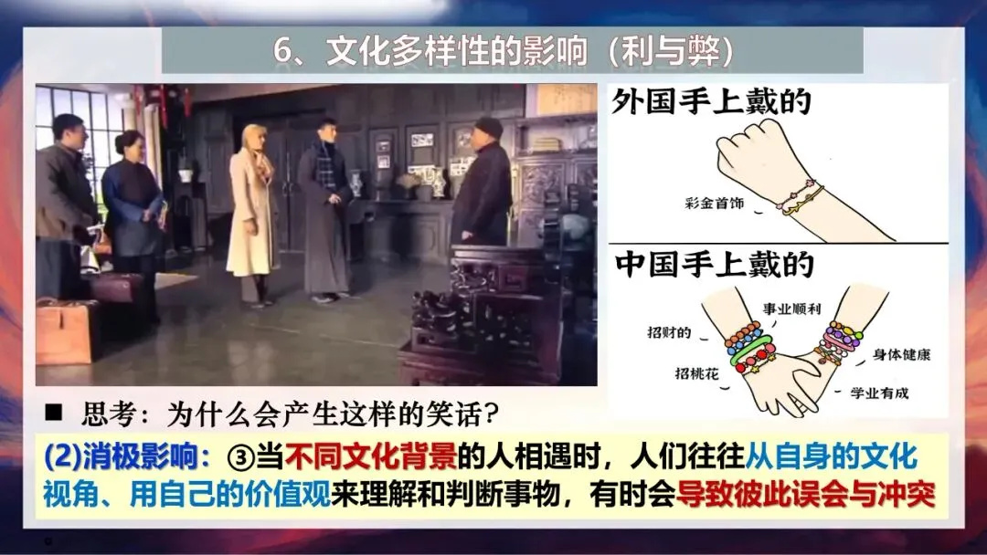 但我们也要注意,文化多样性也可能带来一些问题。当不同文化背景的人相遇时,人们往往会从自身的文化视角、用自己的价值观来理解和判断事物,有时就会导致彼此误会与冲突。比如外国朋友戴彩金首饰可能只是为了装饰,而中国人戴首饰可能会有招财、祈福等寓意,如果不了解这些差异,就可能产生误解。