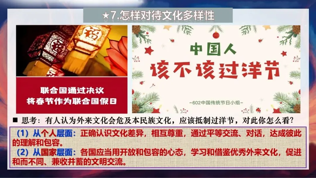 那么我们该如何对待文化多样性呢?有人认为外来文化会危及本民族文化,应该抵制过洋节,大家怎么看?其实这种观点是片面的。从个人层面来说,我们要正确认识文化差异,相互尊重,通过平等交流、对话,达成彼此的理解和包容;从国家层面来说,各国应当用开放和包容的心态,学习和借鉴优秀外来文化,促进和而不同、兼收并蓄的文明交流。联合国将春节作为联合国假日,就是对中国文化的认可,也体现了世界对文化多样性的尊重。我们既要热爱本民族的文化,增强文化自信,也要尊重其他国家和民族的文化,以平等的态度与世界各国人民友好交往。