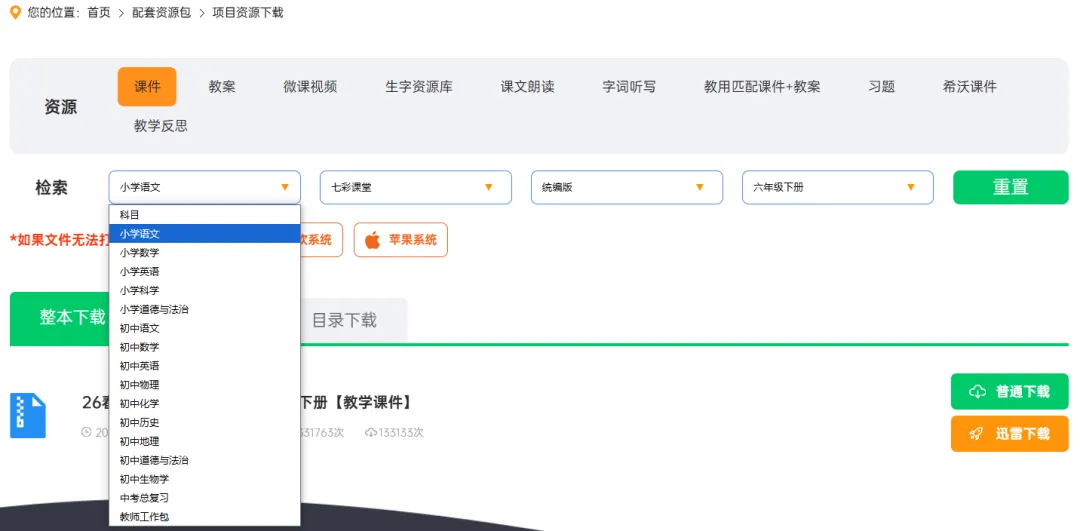在这里可以选择各个学段、各个学科、各个版本的教学资源了。