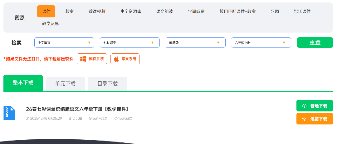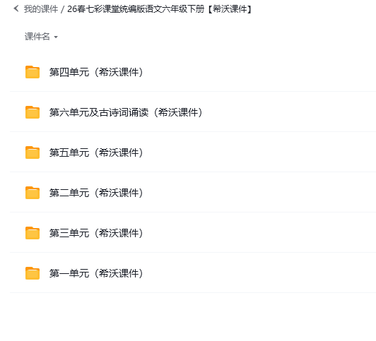 这里面的课件、教案、微课视频、生字资源库、课文朗读、字词听写、教用匹配课件+教案、习题、希沃课件、教学反思应有尽有,下面我仅以课件如何下载给大家举例示范,其他所有资源的下载方法相同。(新教材资源暂时缺乏,还需大家自行整理)