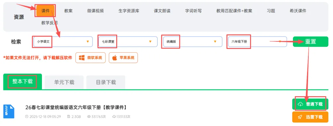 比如我以六年级下册语文为例,先选择好资源,点击后面的重置刷新出该资源。