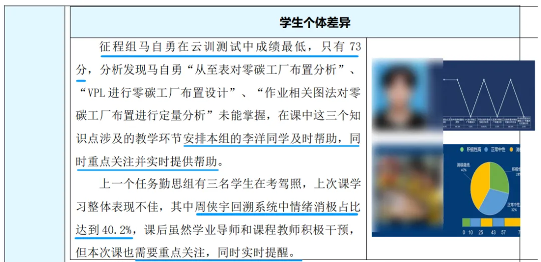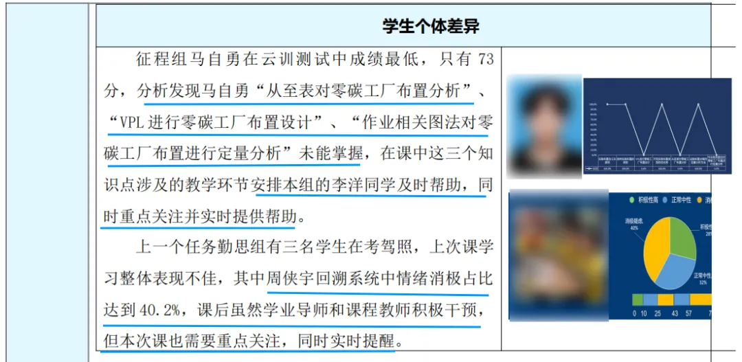 不能只关注整体,要体现出老师关注到了每一个学生。比如国赛一等奖《零碳工厂生产物流数智系统规划与设计》教案的学情分析可以说:“从学习平台的‘数字画像’里发现,马自勇同学在‘作业相关图法’这个知识点上测试不理想(73分),需要重点关注。另外,通过情绪分析工具看到,周侠宇同学近期的消极情绪占比达到了40.2%,课上要多留意他的状态,及时鼓励。”