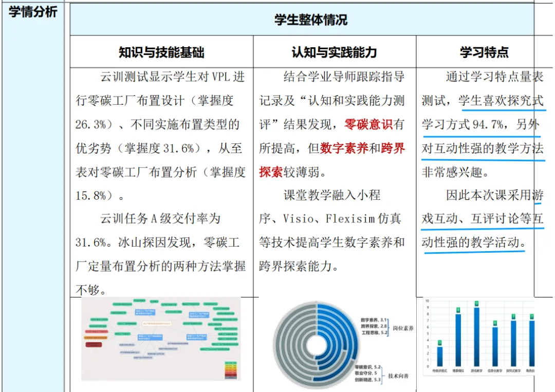 所以老师可以根据学生“数字素养弱”的特点,预判“数据分析”和“软件操作”是难点,并且因此设计了“VR场景+虚拟仿真”的教学方法来应对。整个学情分析,环环相扣,直接指导了后面的教学。