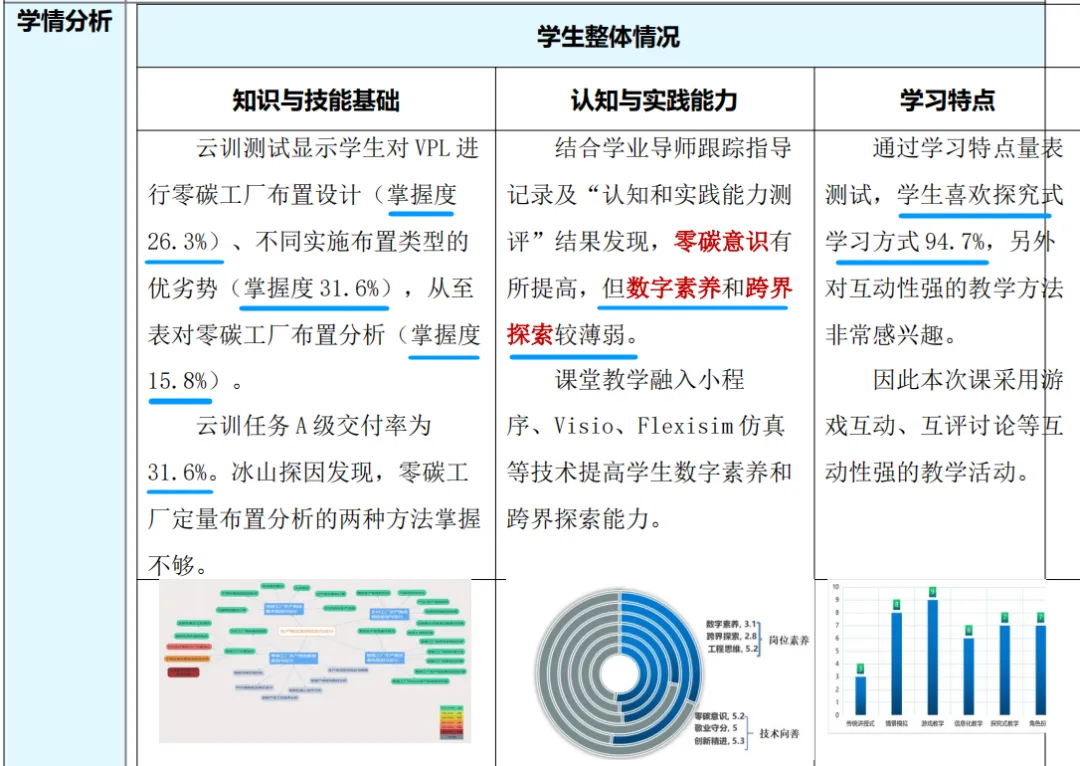 上面属于是非常精准的写法,那现在我们就来看下国赛一等奖《零碳工厂生产物流数智系统规划与设计》教案案例,这份教案的学情分析和教学目标写法也可以值得学习。