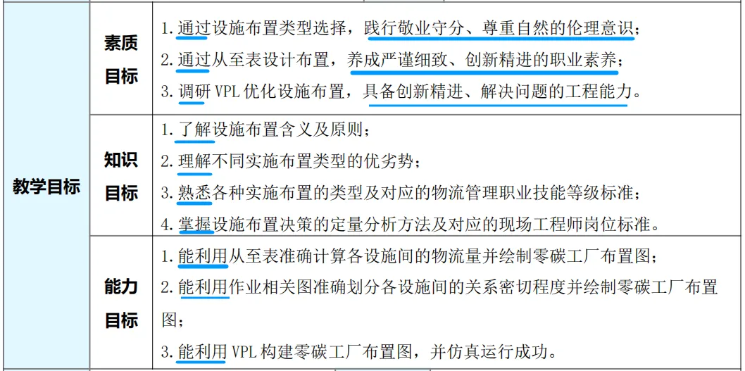 能力目标用“能”、“会”、“运用”这类词。比如不单单说“提升物流规划能力”,而是这样说“能运用从至表法,准确计算车间内各区域间的物流量,并独立画出一张物流图,要求计算结果误差小于5%”。