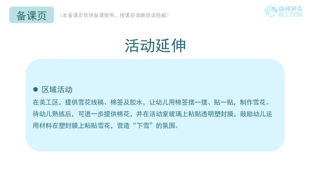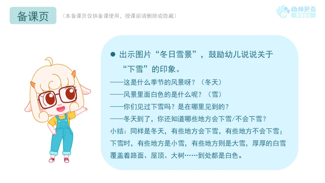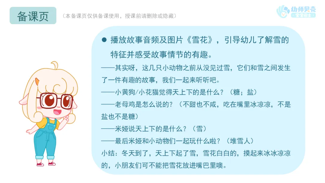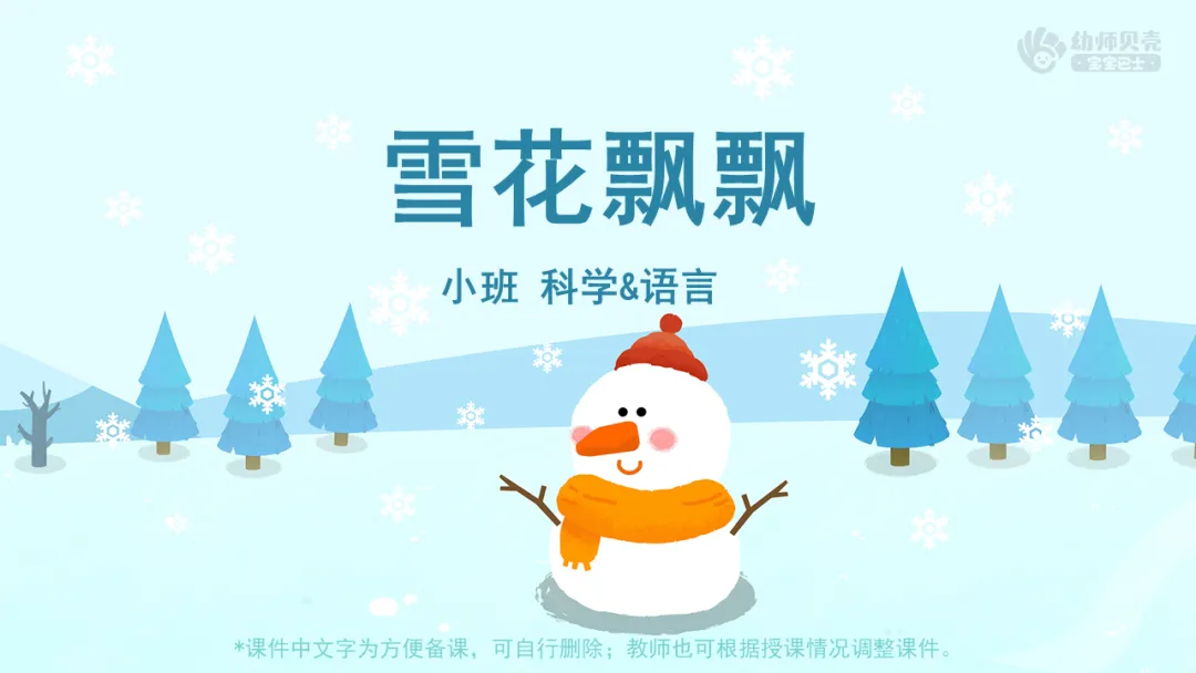 l播放故事音频及图片《雪花》,引导幼儿了解雪的特征并感受故事情节的有趣。