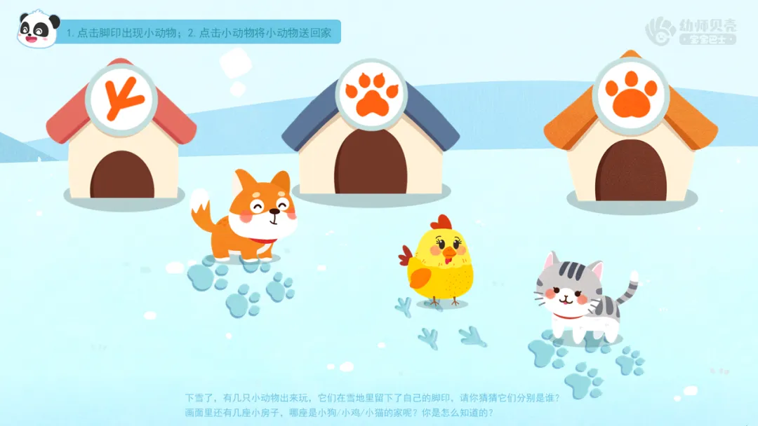 ——画面里还有几座小房子,哪座是小狗/小鸡/小猫的家呢?你是怎么知道的?