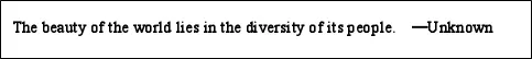 The diversity of its people reflects on: languages, races, religions, traditions, eating, clothes and so on, which make diversity of the world.