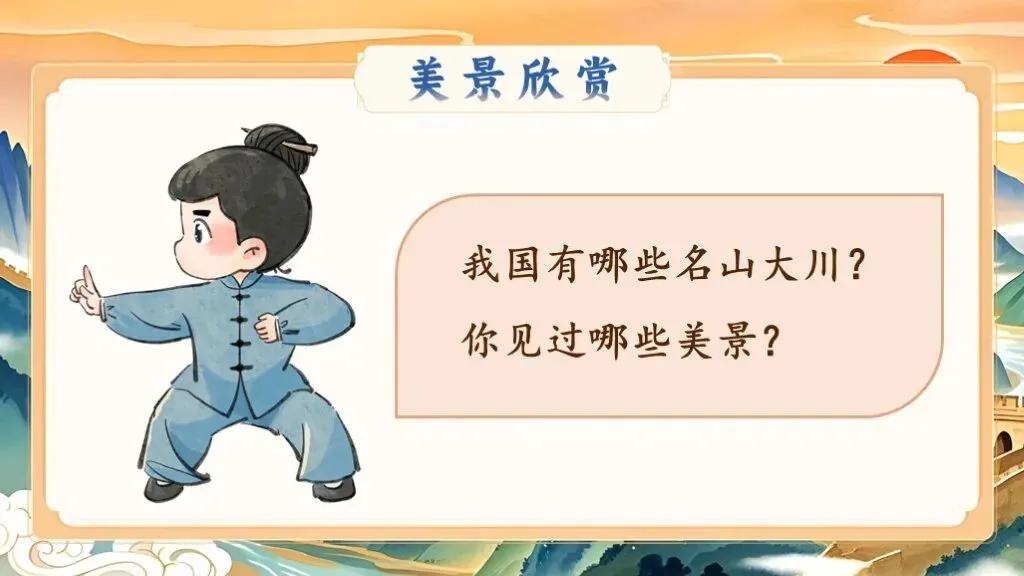 师:同学们,你们看我们的祖国多么广大,今天我们就来学习一首诗歌《神州谣》,一起来感受祖国的壮丽山河。
