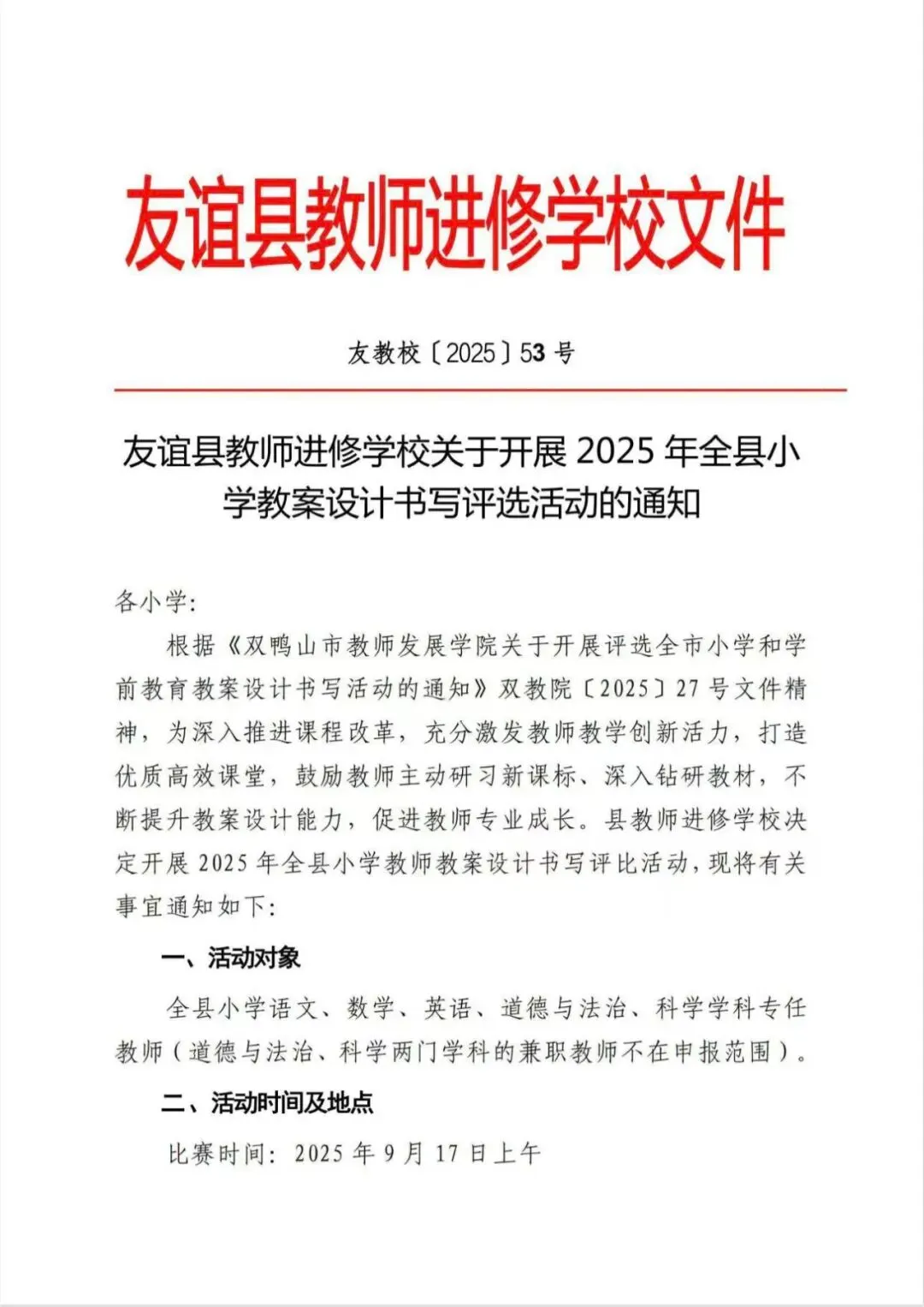 为深入贯彻落实《双鸭山市教师发展学院关于开展2025年全市小学教案设计书写评选活动的通知》精神,进一步提升教师专业素养与教学能力,推动教案设计书写向规范化与创新型方向发展,9月17日,友谊县教师进修学校小学研培部顺利组织开展了全县小学教案设计书写评选活动。