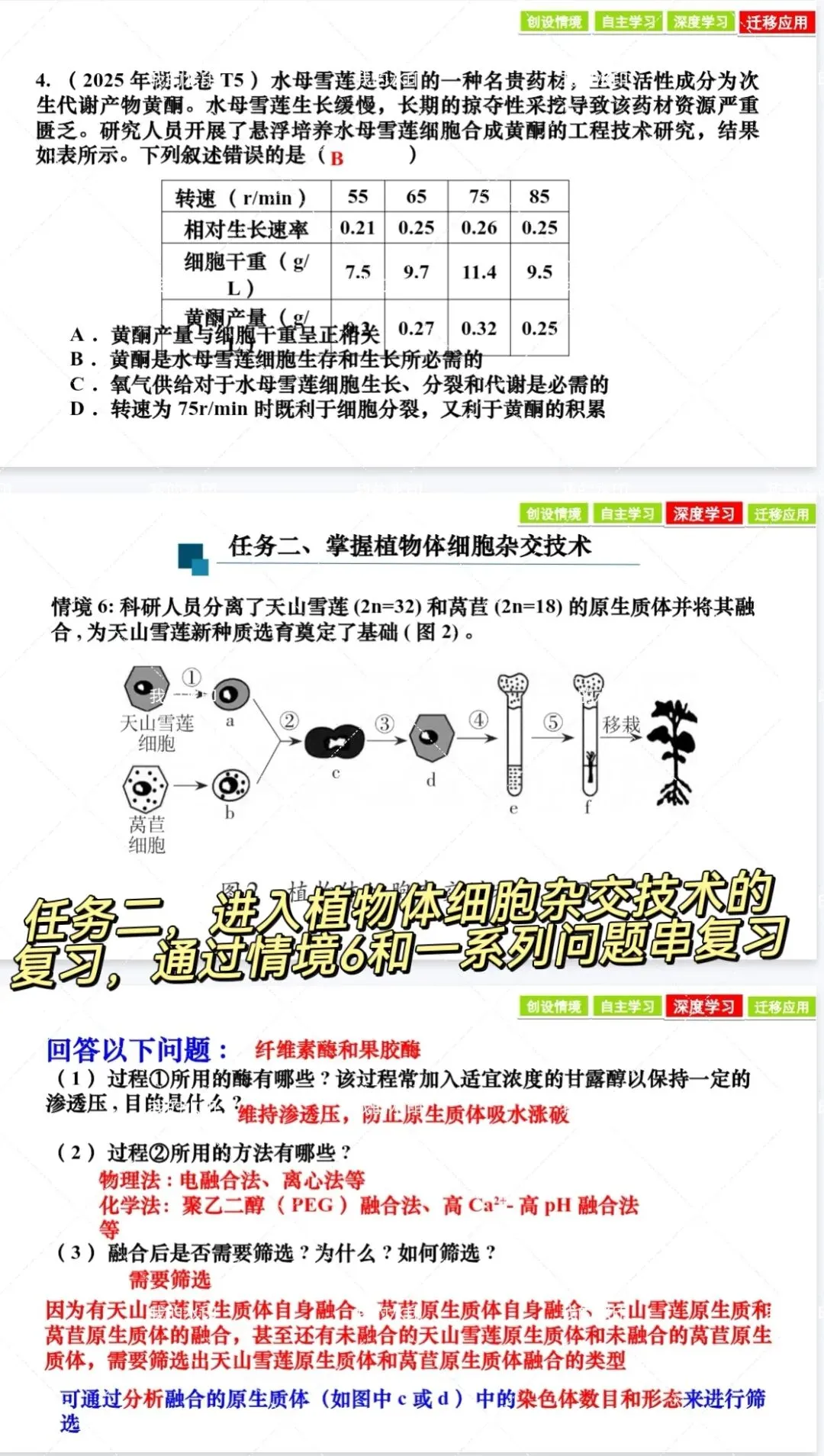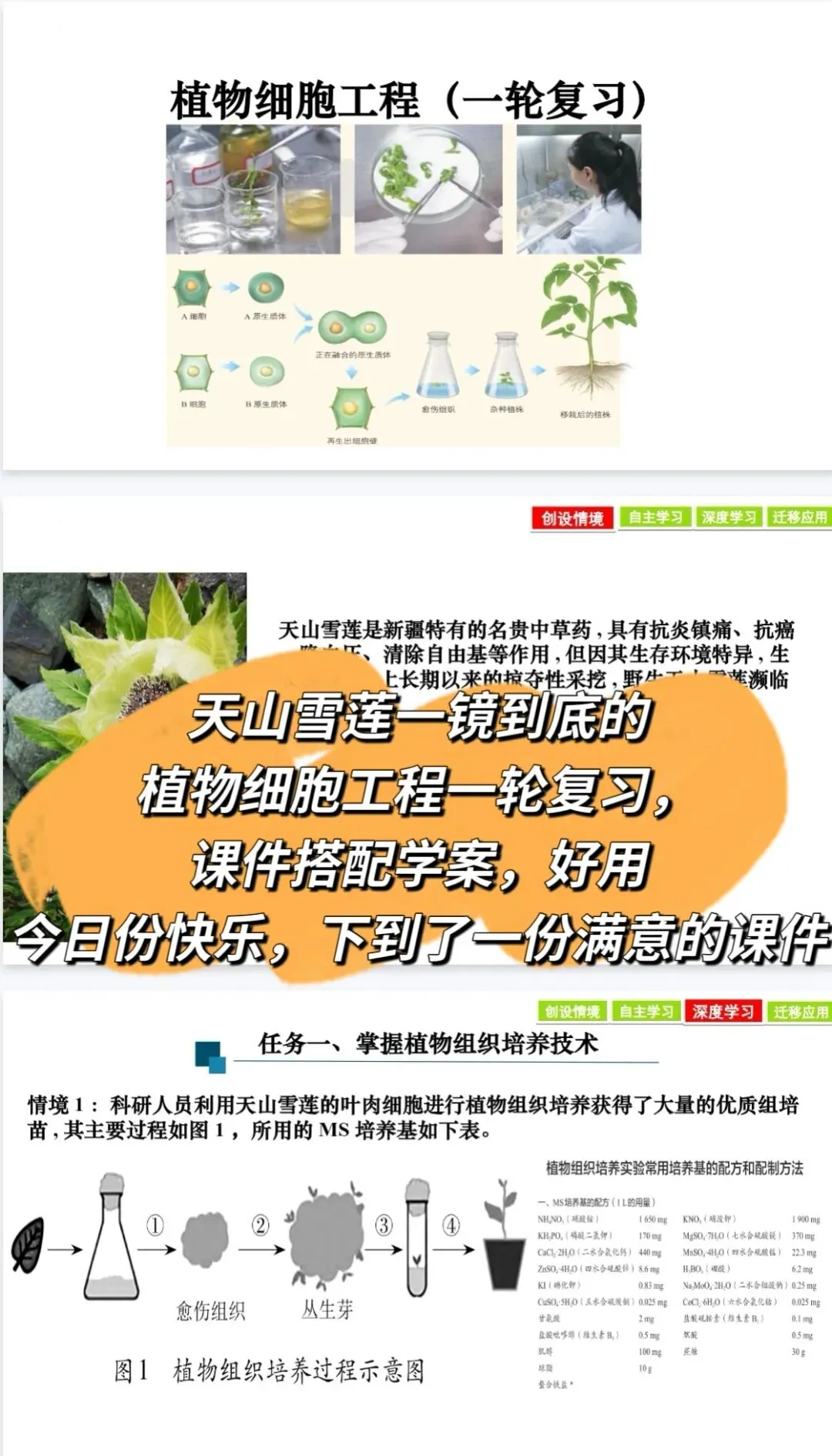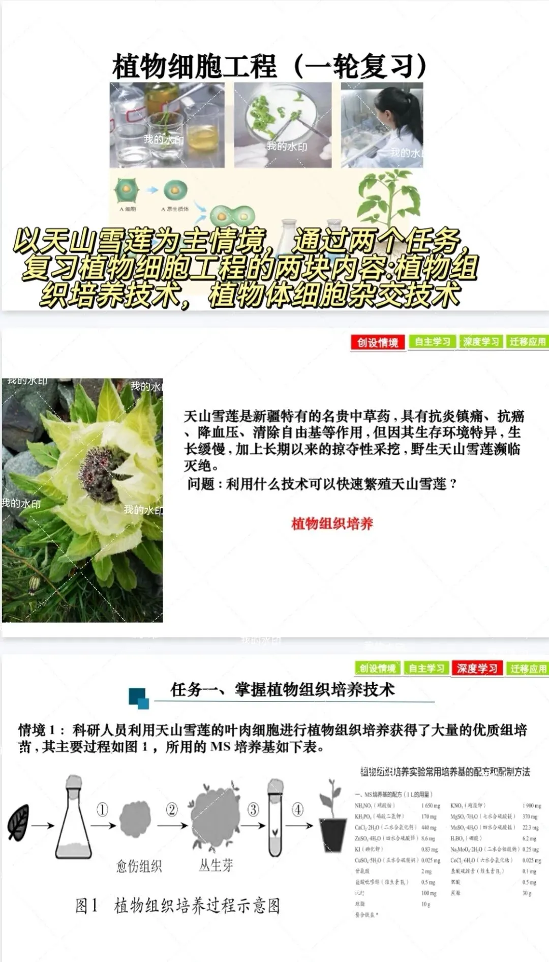 这节课是通过天山雪莲这个主情境,两个任务分别复习植物组织培养技术和植物体细胞杂交技术。一镜到底,而且串的非常舒服,自然。