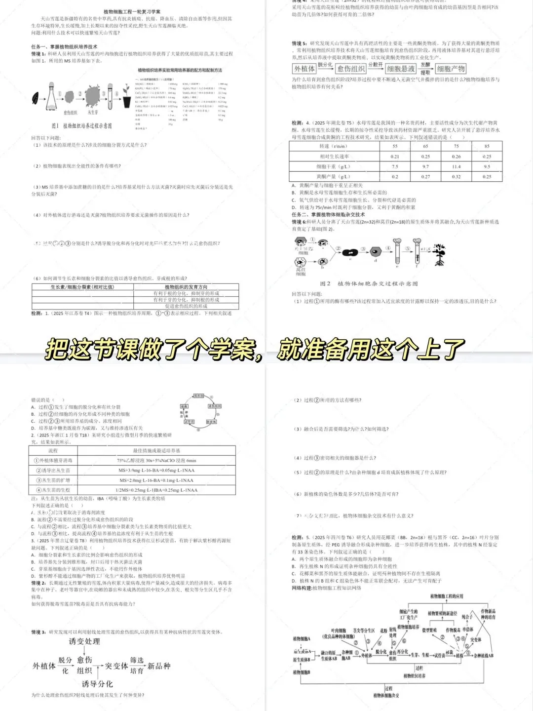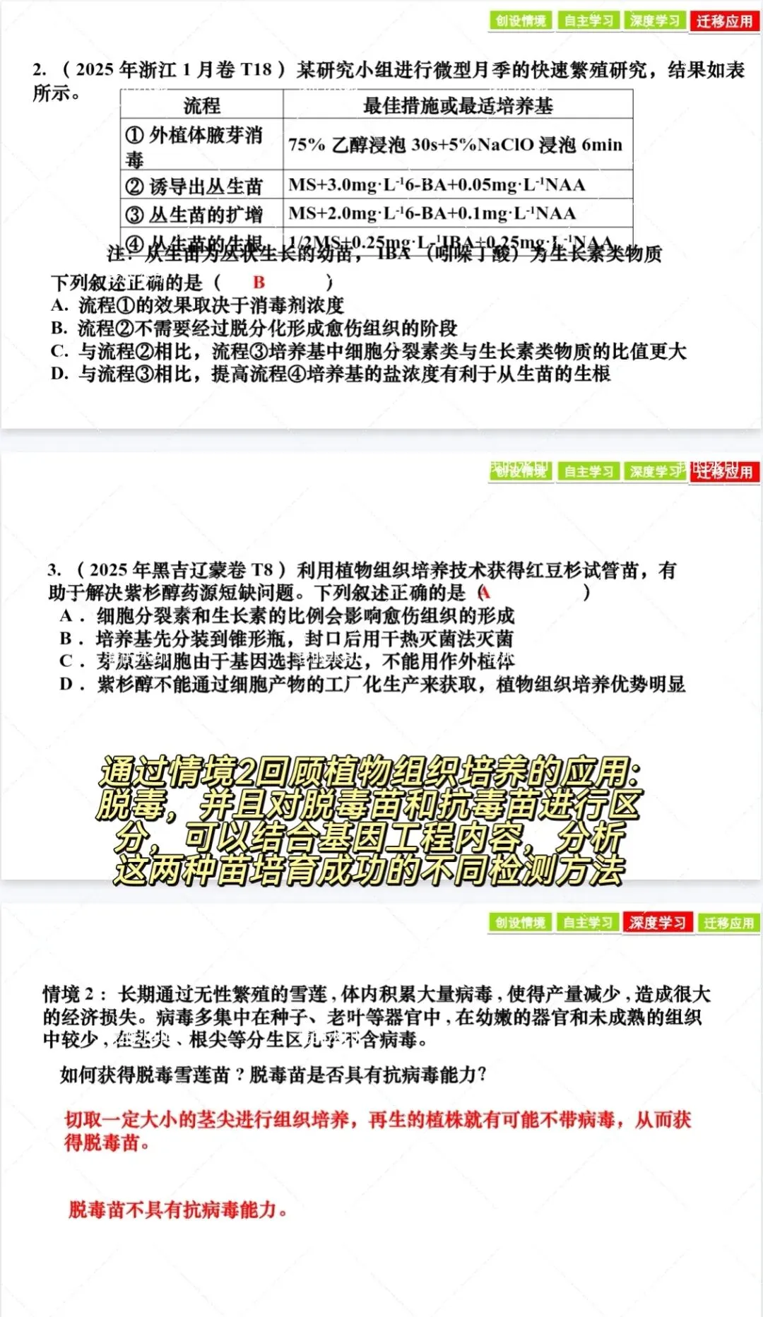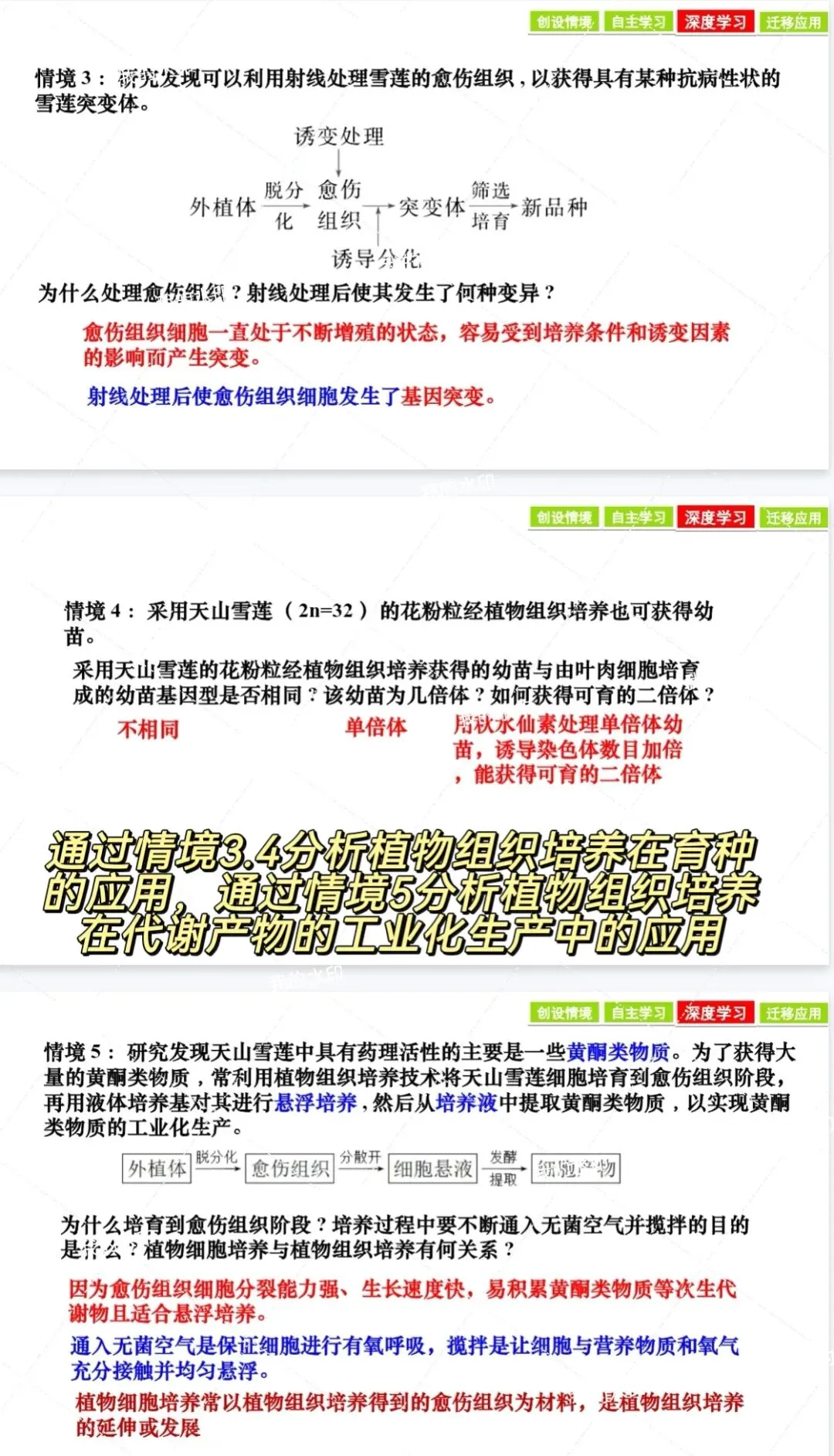 通过情境2.3.4结合一系列问题串,复习植物组织培养技术的应用。把脱毒苗,育种,代谢产物的工业化生产都在这个情境里复习了,全面并且连贯,顺畅。