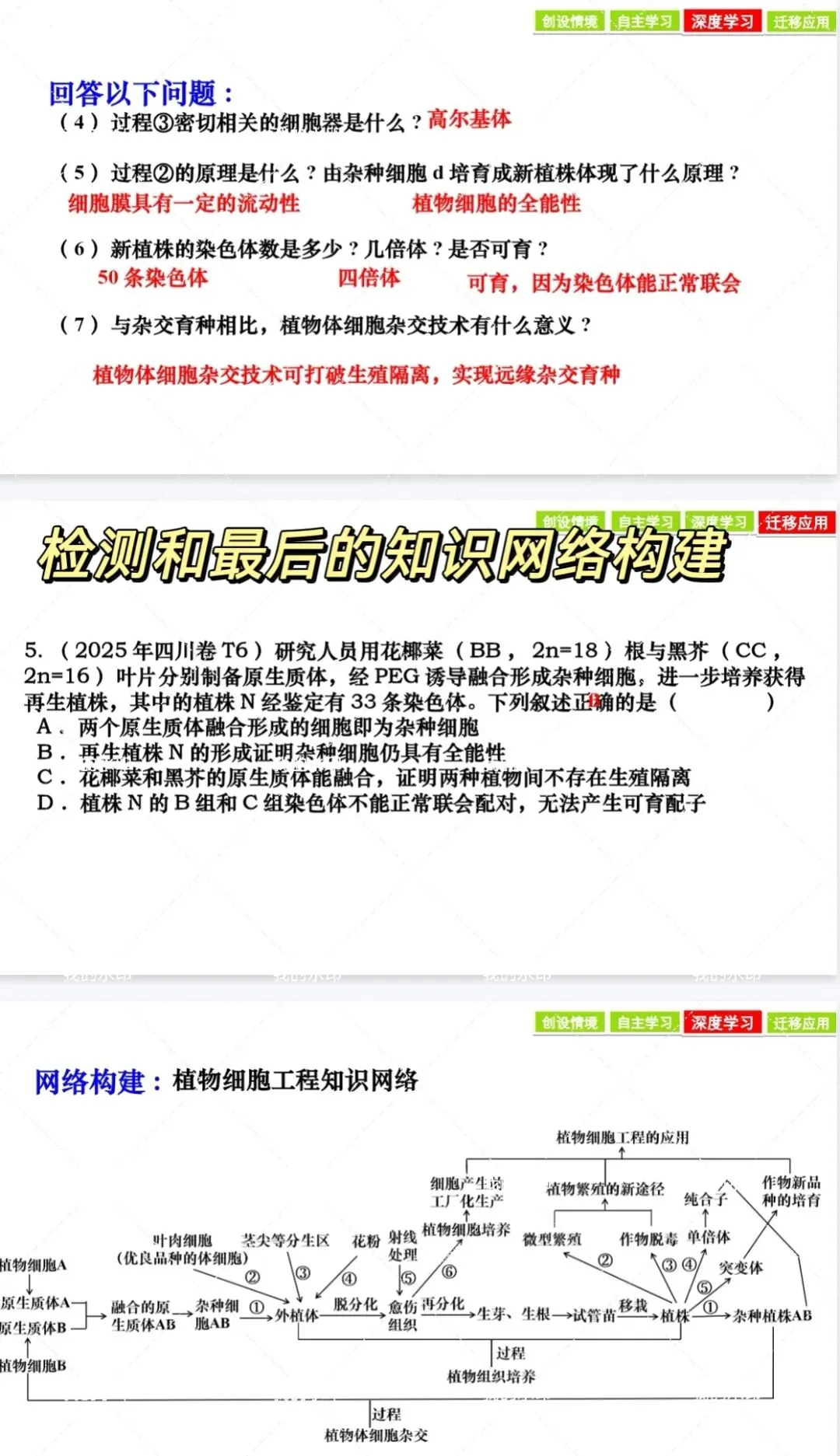 任务二通过情境6和7个问题串来复习植物体细胞杂交技术,把重点知识都串联了进去,并且出示植物细胞工程的知识网络。