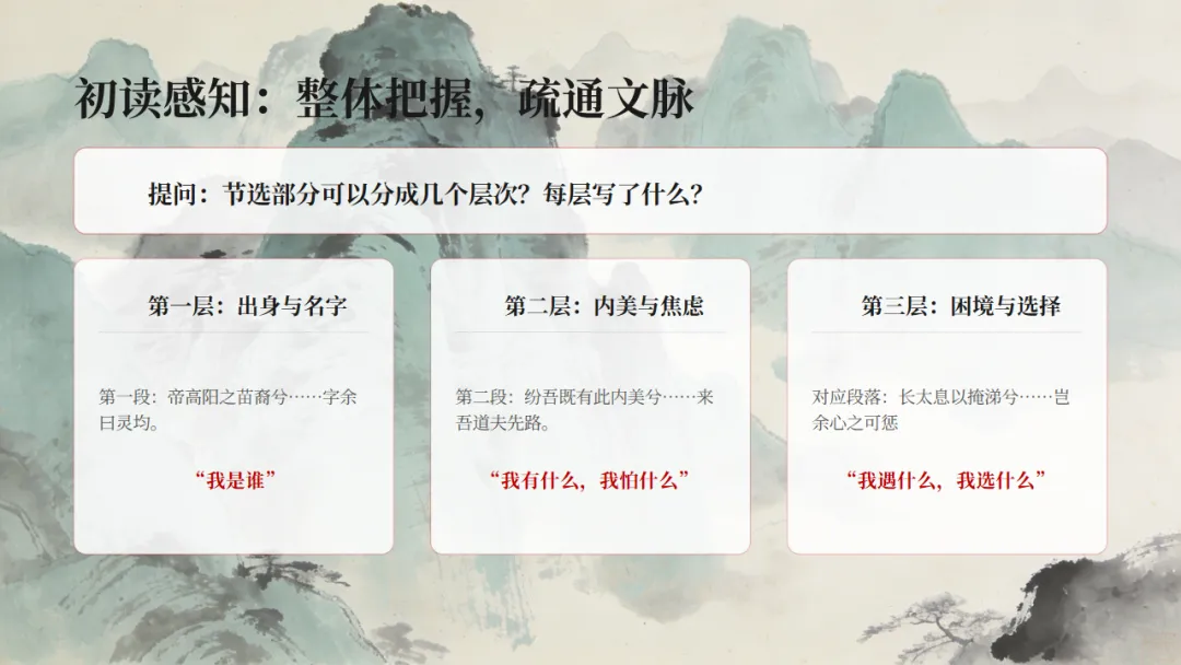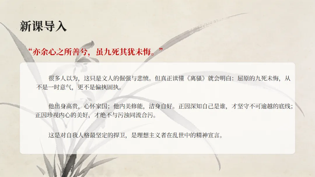 这是对自我人格最坚定的捍卫,是理想主义者在乱世中的精神宣言。今天,就让我们走进《离骚》,去读懂这位千古文人的精神底色,读懂屈原用生命坚守的信仰与高洁。【初读感知】整体把握,疏通文脉
