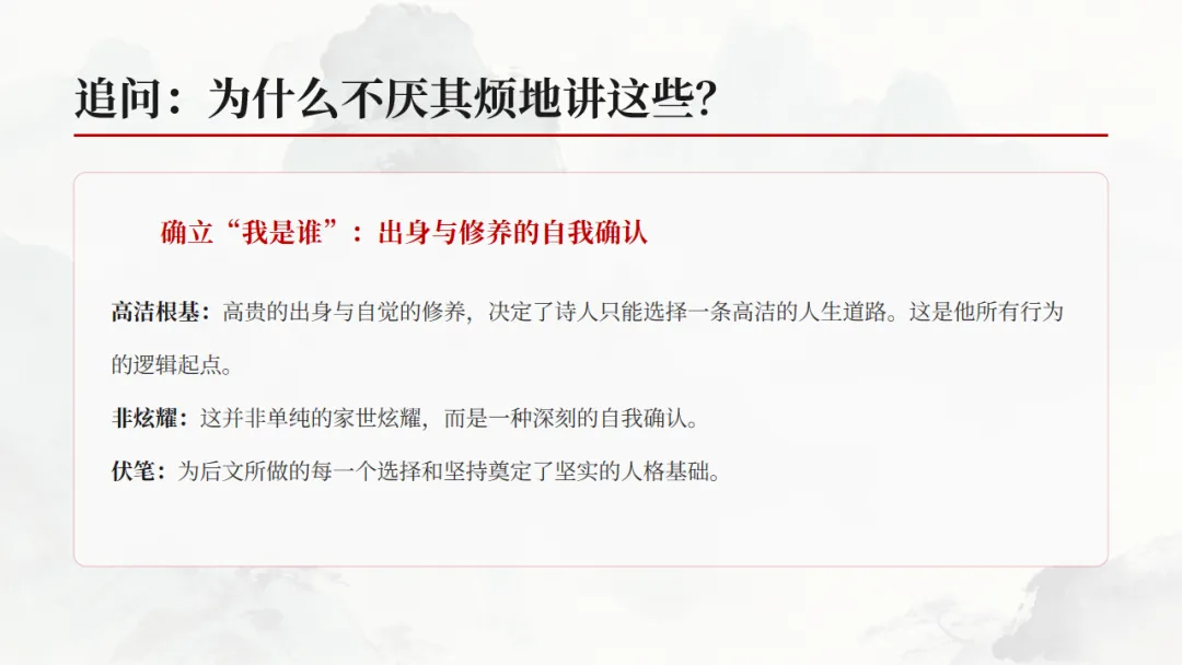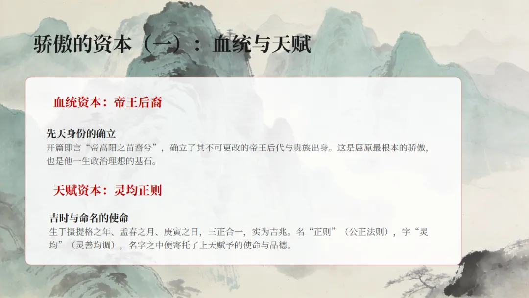 1.血统资本:帝王后代,贵族出身。开篇即确立“我来自最高贵的血统”,这是屈原的“先天身份”,不可更改。