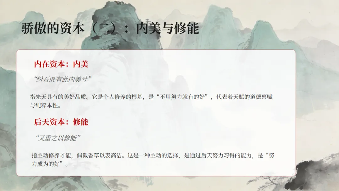 3.内在资本:“纷吾既有此内美兮”——先天具有的美好品质。“内美”是根基,是“不用努力就有的好”,是天赋的道德禀赋。