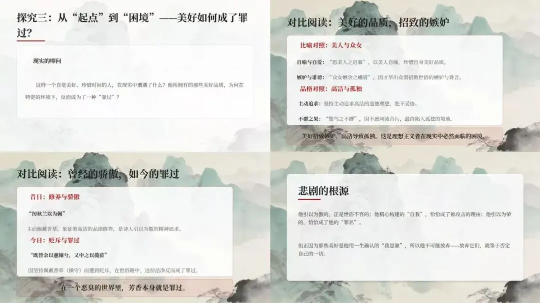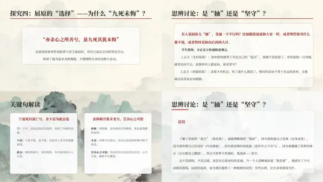 这就是屈原悲剧的根源:他引以为傲的,正是世俗不容的;他精心构建的“自我”,恰恰成了被攻击的理由;他引以为荣的,恰恰成了他的“罪名”。但正因为那些美好是他用一生确认的“我是谁”,所以他不可能放弃——放弃它们,就等于否定自己的一切。探究四:屈原的“选择”——为什么“九死未悔”?