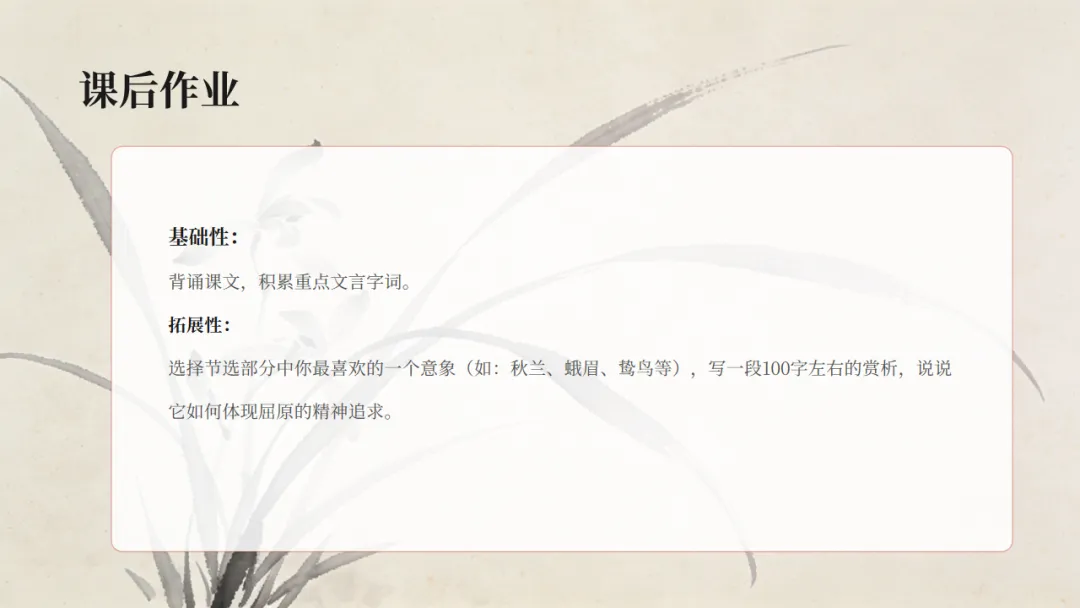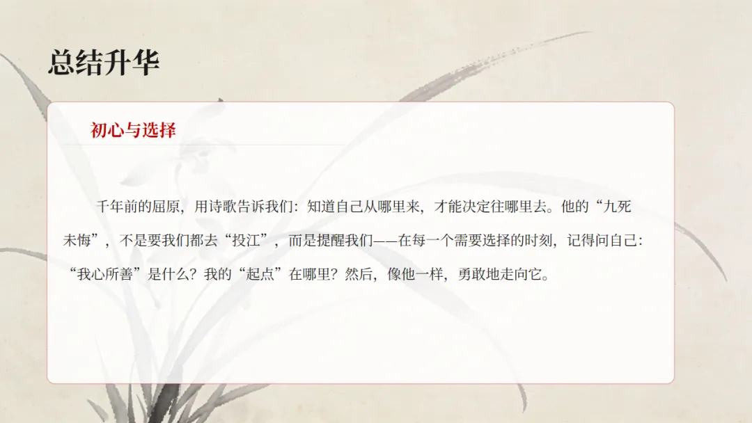 千年前的屈原,用诗歌告诉我们:知道自己从哪里来,才能决定往哪里去。他的“九死未悔”,不是要我们都去“投江”,而是提醒我们——在每一个需要选择的时刻,记得问自己:“我心所善”是什么?我的“起点”在哪里?然后,像他一样,勇敢地走向它。最后齐读:“亦余心之所善兮,虽九死其犹未悔”——让这声音留在教室里,也留在心里。【课后分层作业】