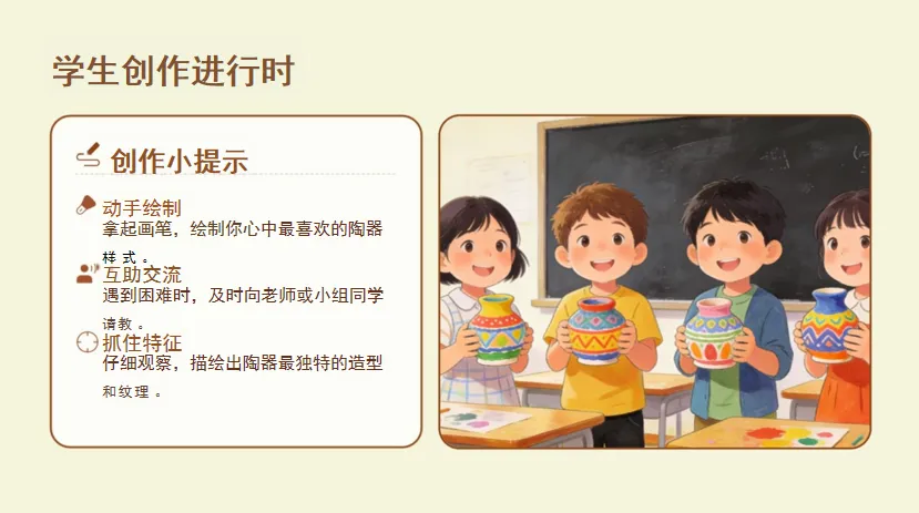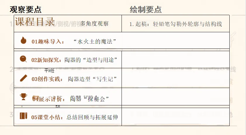 技能维度:聚焦“陶器造型的观察方法”与“简笔绘制能力”,学习从“造型特点、用途、细节巧思”分析陶器,并完成陶器造型的绘制与用途介绍;