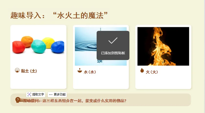 (一)趣味导入:“水火土的魔法”(5分钟)