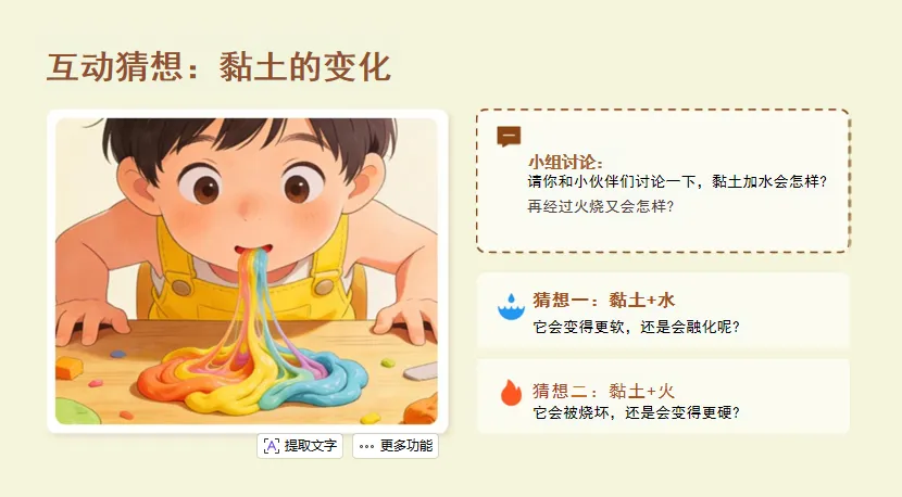 2.互动猜想:请学生说说“黏土加水会怎样?再经过火烧又会怎样?”