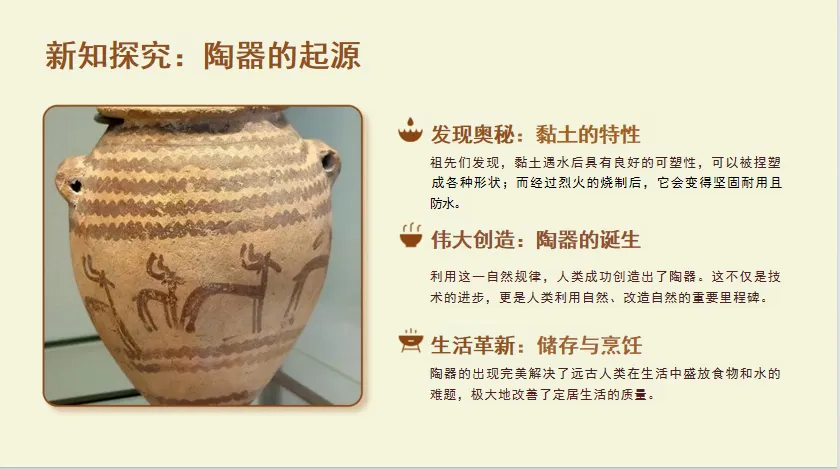 先民发现“黏土遇水塑形,经火烧变坚固”,创造出陶器,解决了“盛放食物、液体”的需求。