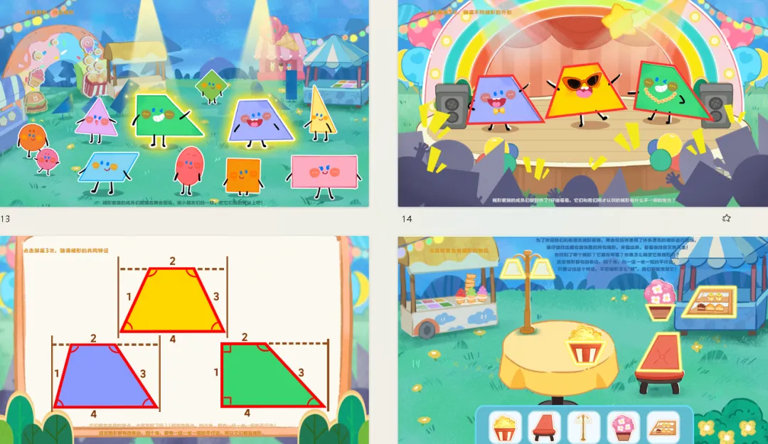 1.分发纸面教具,在舞会场景中,找出所有不同大小、方向、颜色的梯形。